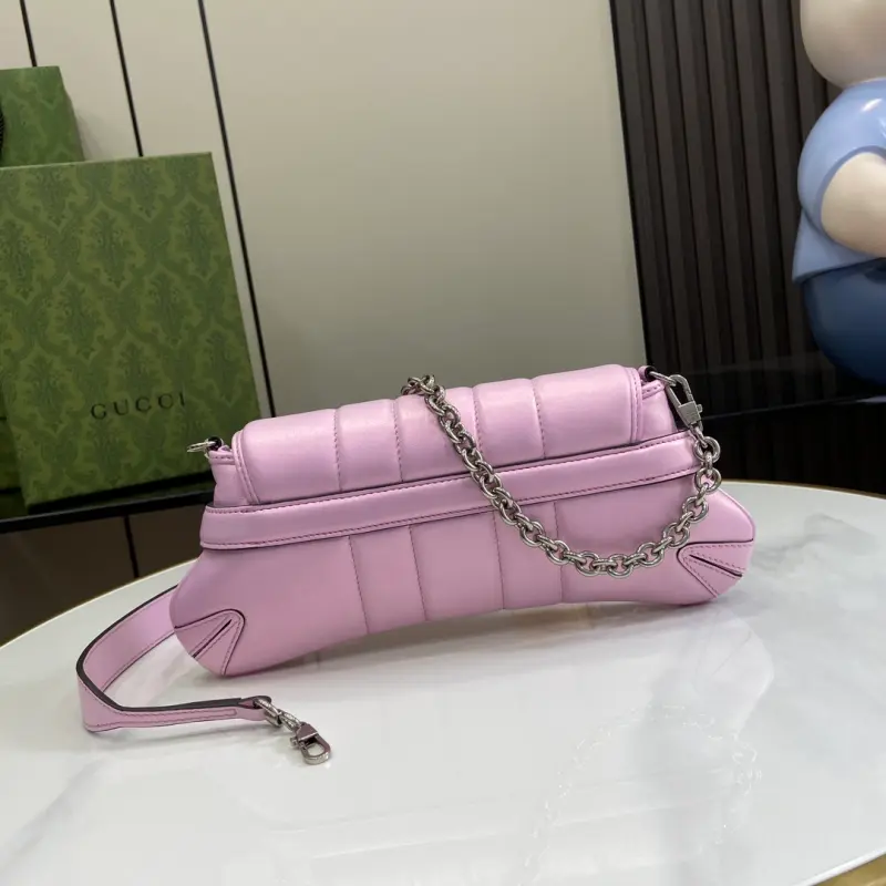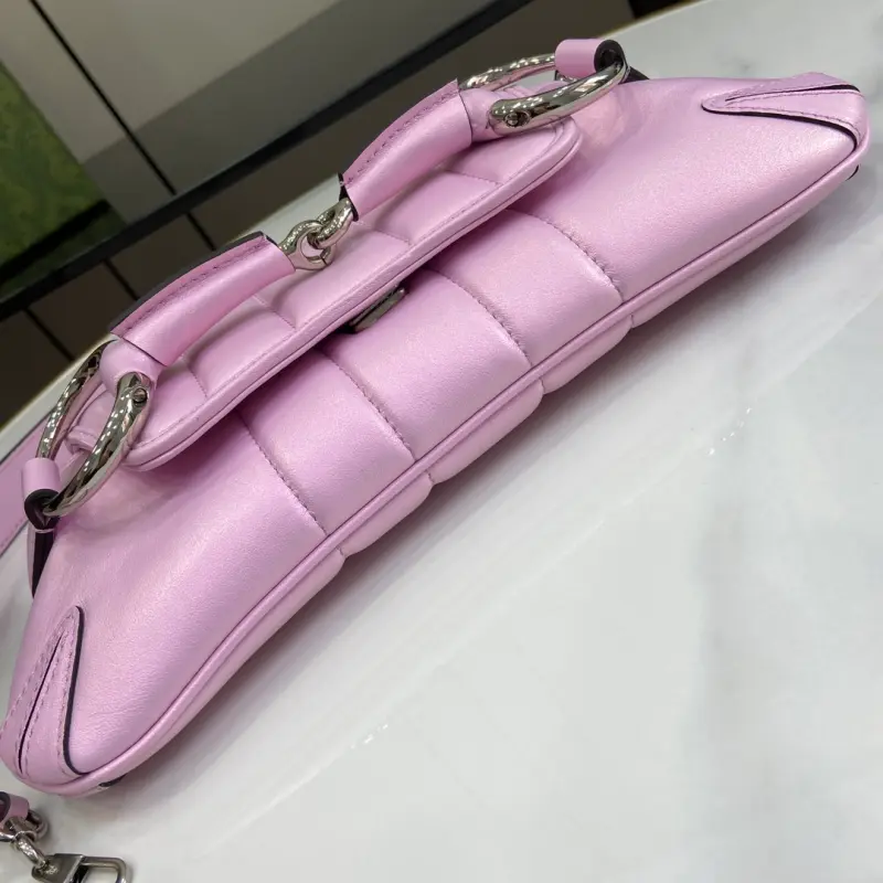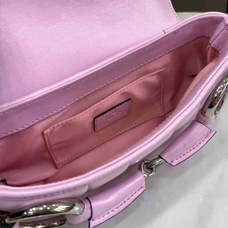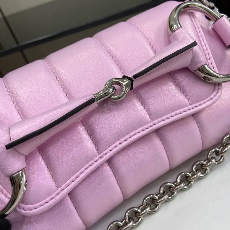 Gbag Horsebit Chain Small Shoulder Bag (Includes Full Original Green Box). Gbag reinterprets a classic brand element, skillfully blending archival design with modern innovation to embody a contemporary aesthetic. This bag, ingeniously embellished with the horsebit design, a signature element of the early 2000s, celebrates the brand’s heritage. For the Fall/Winter 2023 collection, this bag is reimagined with a variety of colors and textures for a modern twist. It features iridescent pink quilted leather and palladium hardware. As a select item with the Gbag Tag, this item is NFC-enabled for a digitally innovative experience. Satin lining, horsebit buckle, interior: one card compartment, one pocket, detachable leather strap (23 cm drop), detachable chain shoulder strap (19 cm drop), and magnetic snap closure. Model No. 764339. Dimensions: 11.5 cm (length) x 27 cm (width) x 5 cm (depth). Color: iridescent pink/original leather.