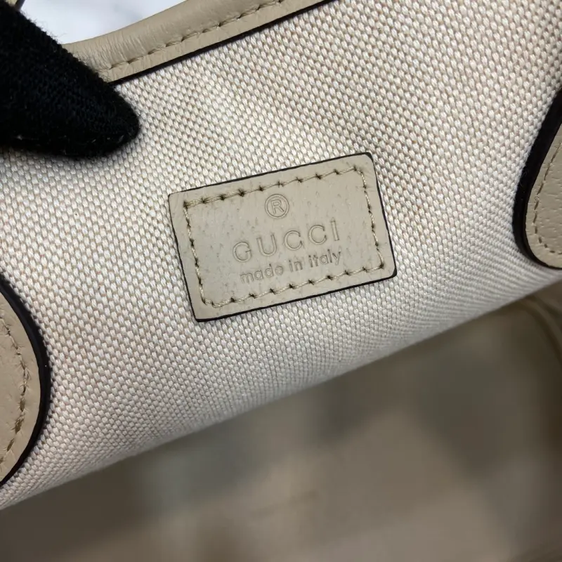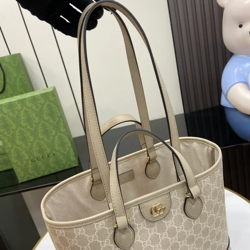 Ophidia GG Mini Tote Bag (Includes full original green box packaging). The Ophidia collection is reimagined in new sizes and styles, featuring a combined handle and shoulder strap for versatile carrying options. This tote is crafted from beige and ebony GG Supreme canvas, enhanced by the signature Double G hardware. It features blue and ebony GG Supreme canvas with blue leather trim and gold-tone hardware. As a select item with the Gbag Tag, this item is NFC-enabled for an innovative digital experience. It features a cotton and linen blend lining with Double G, handles (12cm drop), and shoulder strap (28.5cm drop). Model No. 765043. Dimensions: 31cm (width) x 25cm (height) x 13cm (depth). Color: Blue/PVC.