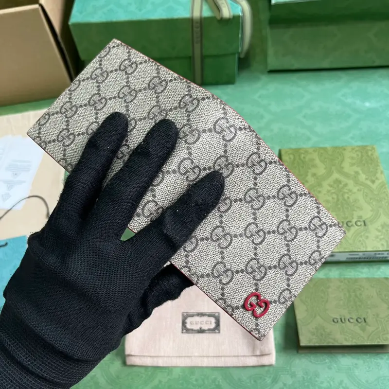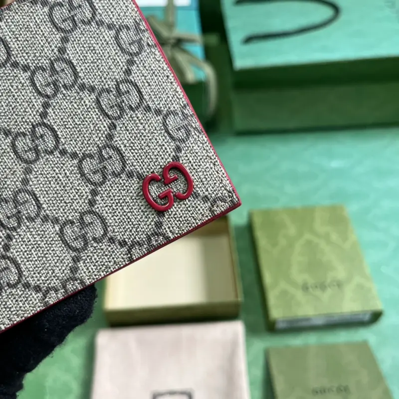 Wallet with GG details (comes with the original green box). Gbag’s small leather accessories push the boundaries of design, constantly reinterpreting classic pieces in unique ways. This men’s wallet expertly combines classic GG Supreme canvas with yellow GG hardware, creating a sophisticated, modern accessory. Made of beige and ebony GG Supreme canvas with yellow leather trim, brass hardware, and a yellow ceramic-effect finish, it features a moir?? fabric lining with GG details. The interior includes 10 card slots and a bill compartment. Model No. 768243. Dimensions closed: 11 (W) x 9 (H) cm. Dimensions open: 21 (W) x 9 (H) cm. Color: Red/PVC.