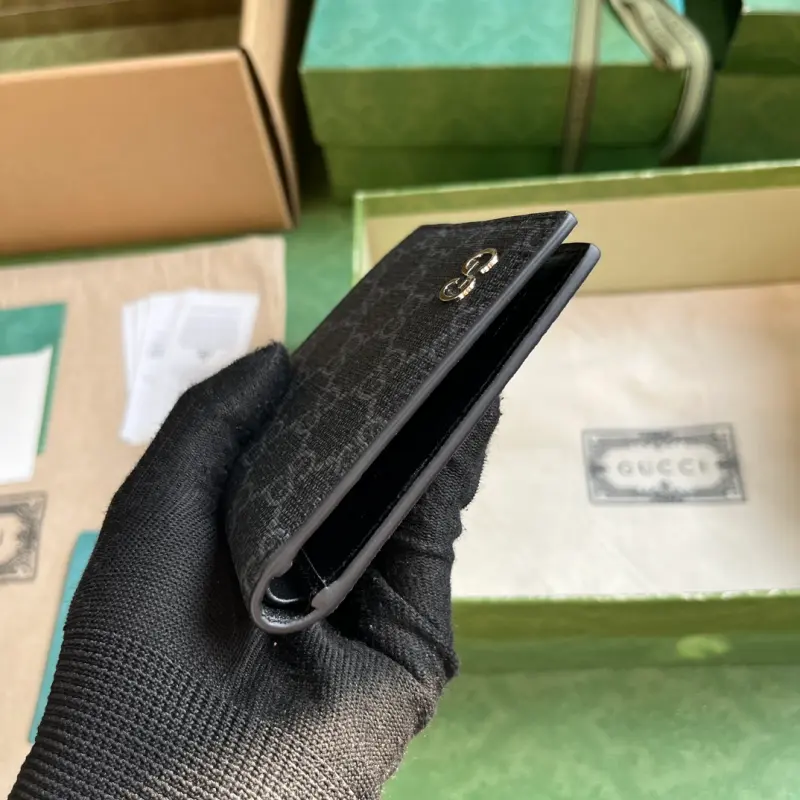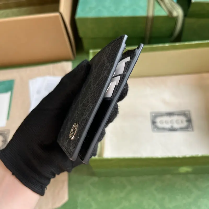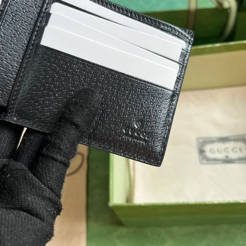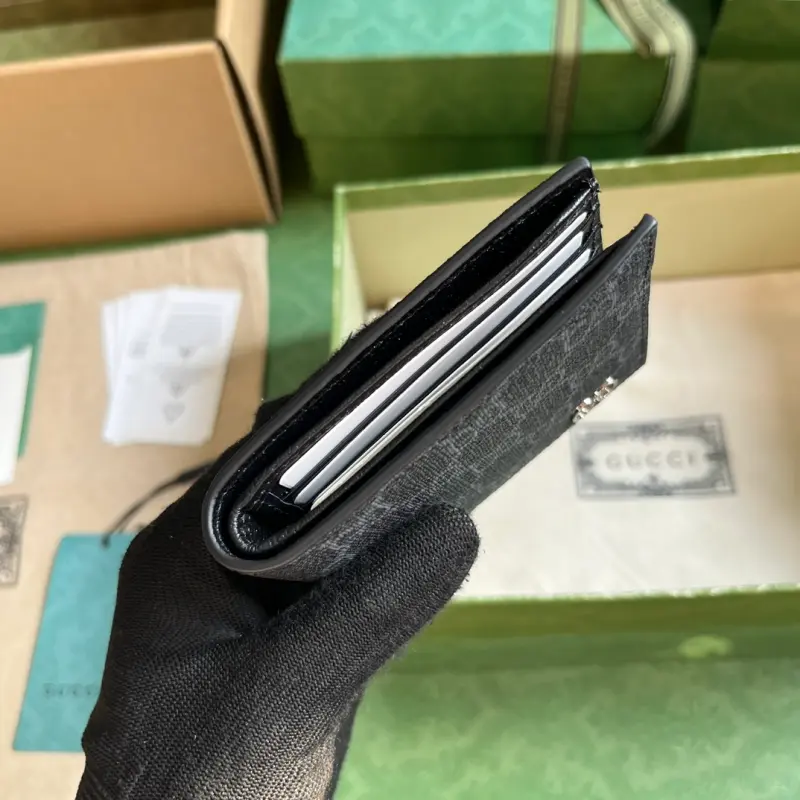 Wallet with GG details (comes with the original green box). Gbag’s small leather accessories push the boundaries of design, constantly reinterpreting classic pieces in unique ways. This men’s wallet expertly combines classic GG Supreme canvas with yellow GG hardware, creating a sophisticated, modern accessory. Made of beige and ebony GG Supreme canvas with yellow leather trim, brass hardware, and a yellow ceramic-effect finish, it features a moir?? fabric lining with GG details. The interior includes 10 card slots and a bill compartment. Model No. 768243. Dimensions closed: 11 (W) x 9 (H) cm. Dimensions open: 21 (W) x 9 (H) cm. Color: Black/Black PVC.