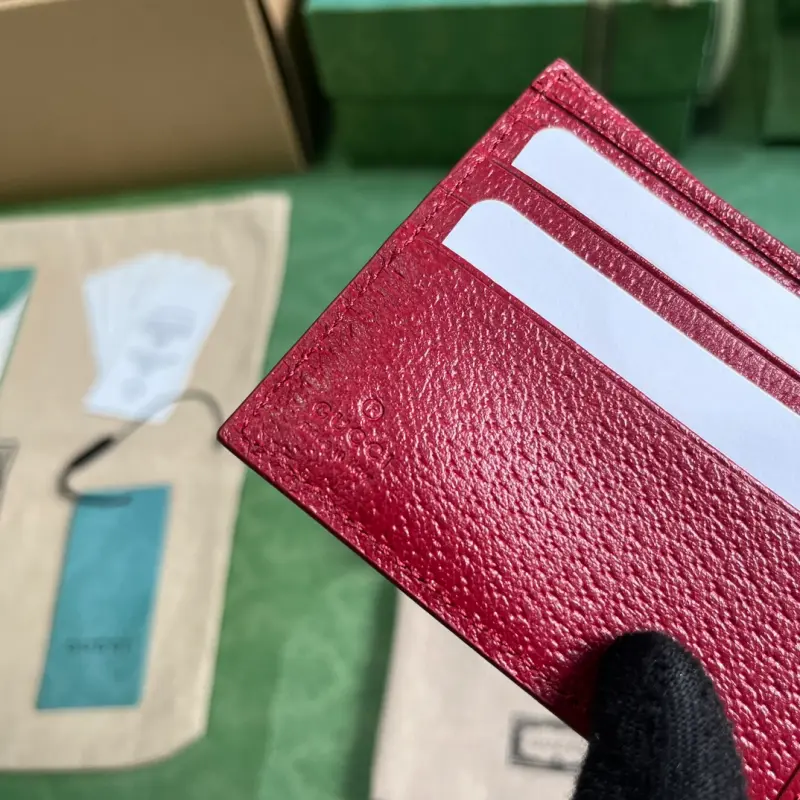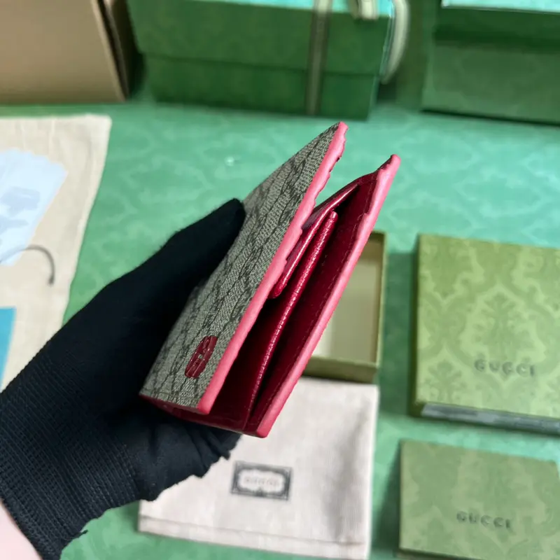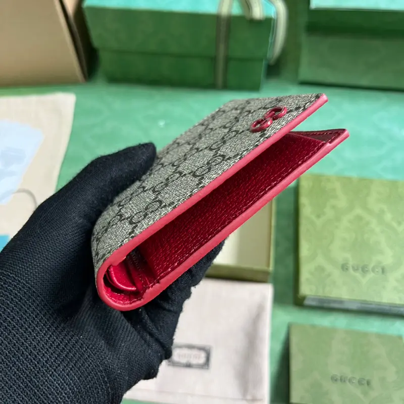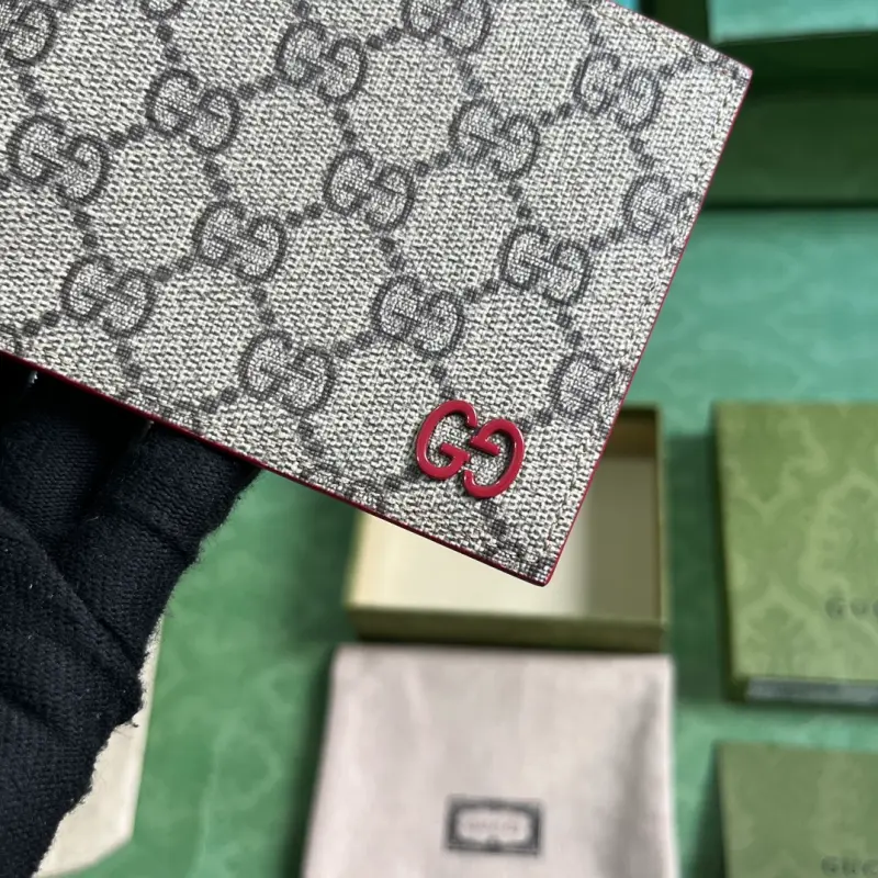 Wallet with GG details (comes with the original green box). Gbag’s small leather accessories push the boundaries of design, constantly reinterpreting classic pieces in unique ways. This men’s wallet expertly combines classic GG Supreme canvas with green GG hardware, creating a sophisticated, modern accessory. Made of beige and ebony GG Supreme canvas with green leather trim, brass hardware, and a green ceramic-effect finish, it features a moir?? fabric lining with GG details. Interior: card compartment, coin pouch, and bill compartment. Model No. 768244. Dimensions closed: 11 (W) x 9 (H) cm. Dimensions open: 21 (W) x 9 (H) cm. Color: Red/PVC.