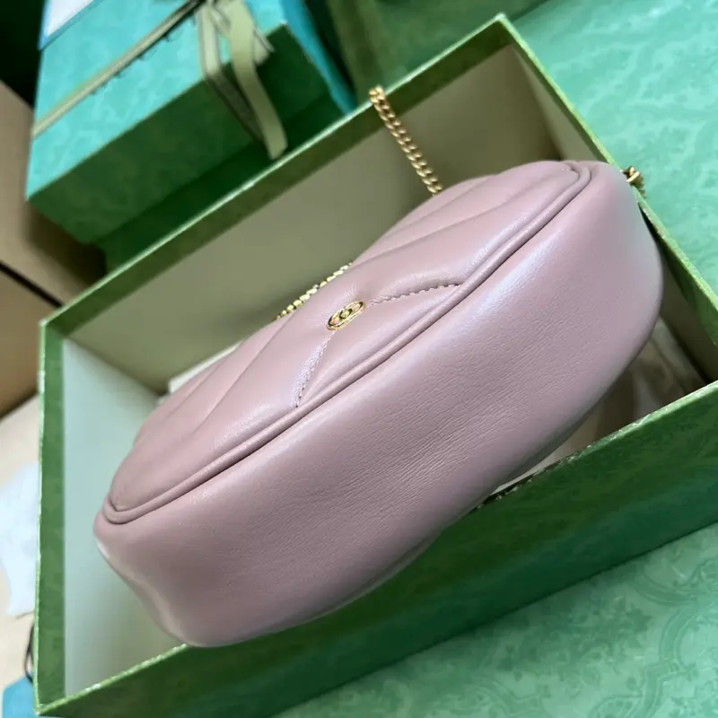 GG Marmont Half-Moon Mini Handbag (Includes Full Original Green Box). This GG Marmont Half-Moon Mini Handbag reimagines a classic silhouette in soft leather, accented with a small Double G stud. Tonal leather trim complements the luxurious blush hue, ushering in a glamorous new season. Features full blush V-shaped quilted leather, blush leather trim, antique gold-tone hardware, a small Double G stud, and a silk satin and moir?? fabric lining. Interior: two card slots, a hook closure, an adjustable handle (16 cm drop), a chain shoulder strap (60 cm drop), and a zipper closure. Weight: approximately 0.4 kg. Model No. 770983. Dimensions: 21 cm (width) x 16 cm (height) x 5 cm (depth). Color: blush/original leather.