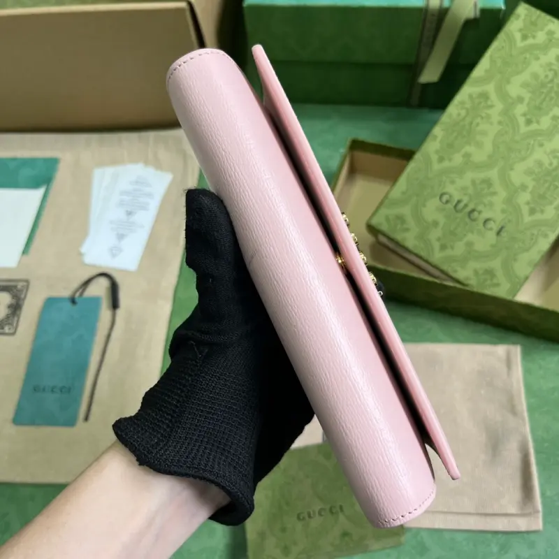 [Includes full original green box packaging] Long wallet with handwritten Gbag logo. Exploring self-expression with limitless possibilities has become the essence of the brand’s design. This wallet is expertly crafted from light pink leather and embellished with gold-tone hardware featuring the handwritten Gbag logo, adding a touch of signature charm. Light pink leather, gold-tone hardware, taffeta lining, and handwritten Gbag logo details. Model No. 772638. Dimensions: 19cm (length) x 10cm (width) x 3.5cm (thickness). Color: Light pink/original leather.