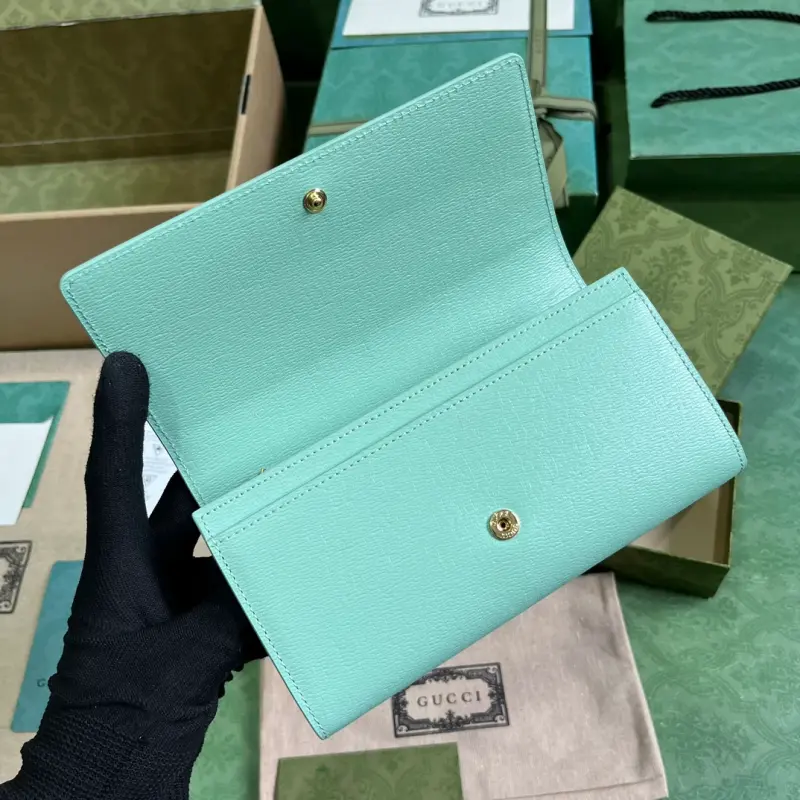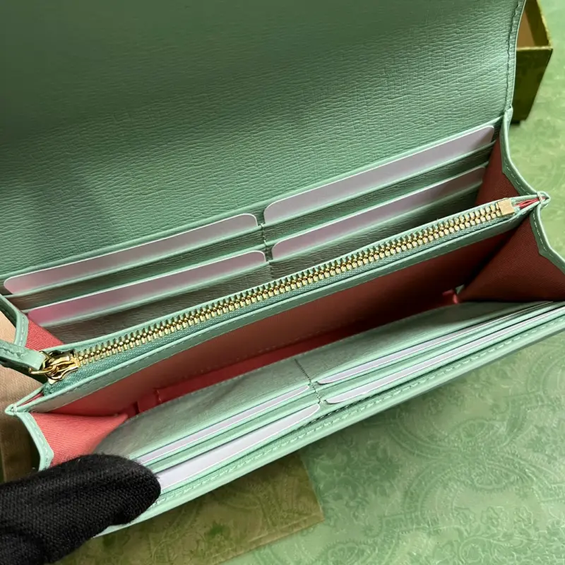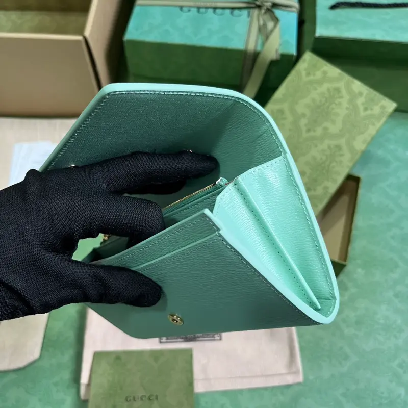 [Includes full original green box packaging] This wallet features a handwritten Gbag logo. Exploring self-expression with limitless possibilities has become the essence of the brand’s design. This wallet is expertly crafted from light green leather and embellished with gold-tone hardware featuring the handwritten Gbag logo, adding a touch of signature charm. Light green leather, gold-tone hardware, taffeta lining, and handwritten Gbag logo details. Model No. 772638. Dimensions: 19cm (length) x 10cm (width) x 3.5cm (depth). Color: Light Green/Original Leather.