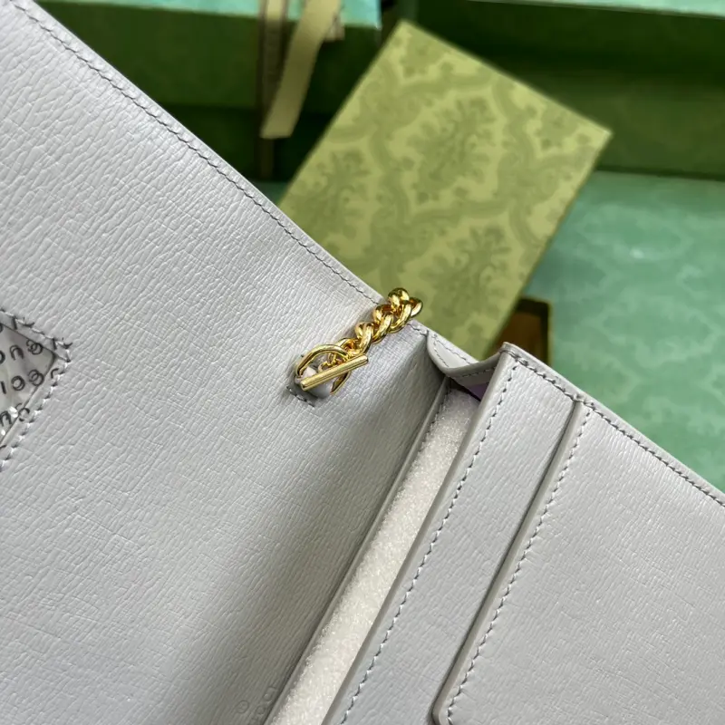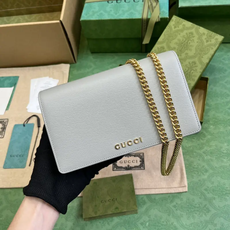 This chain wallet features a handwritten Gbag logo. The small leather accessory collection seamlessly blends modern fashion elements, creating timeless pieces that are timeless and reminiscent of classics, bringing a fresh touch to formal leather pieces. This chain wallet is expertly crafted from light gray leather and subtly detailed with a gold-tone handwritten Gbag logo. It features light gray leather, gold-tone hardware, a taffeta lining, and a handwritten Gbag logo detail. The interior includes six card slots, a flat pocket, a gusseted zip pocket, and an open compartment. It also features a chain strap and snap button closure. Model No. 772643. Dimensions: 12.5cm (length) x 20cm (width) x 4cm (depth). Color: Light Gray/Original Leather.