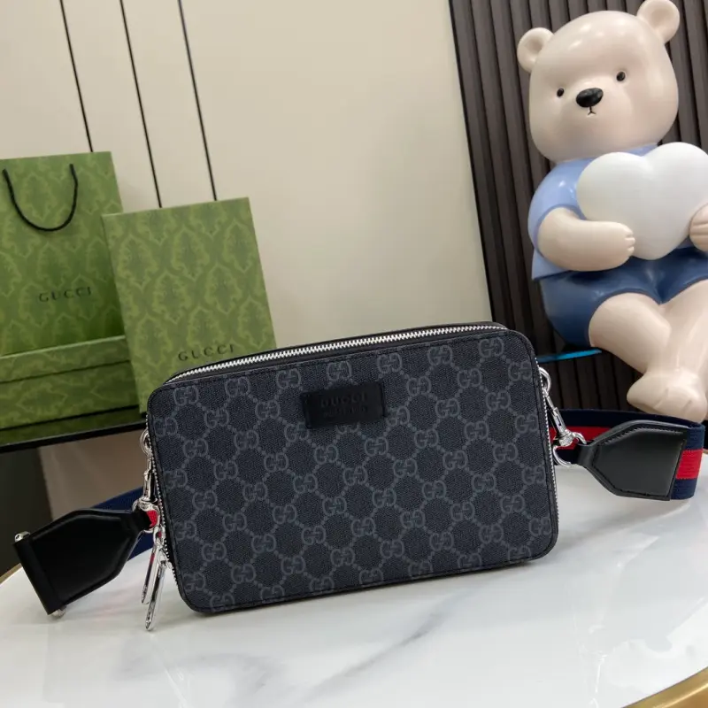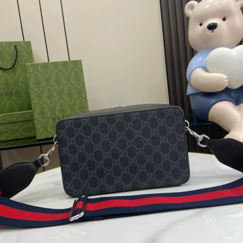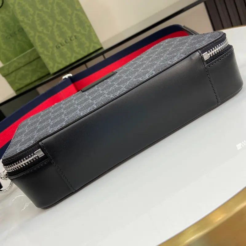 Comes with a complete set of original green box packaging. GG Supreme canvas is a timeless classic material from the brand. Crafted from a coated microfiber fabric with a soft and stretchy feel, this mini shoulder bag is available in black. The red and blue striped web adds a classic touch to the design. Black GG Supreme canvas with black leather trim, red and blue web, and a cotton, linen, and moir?? fabric lining. Interior: three card slots, a detachable and adjustable web strap (51 cm high), and a zipper closure. Weight: approximately 0.6 kg. Model No. 774161. Dimensions: 14 cm (length) x 22.5 cm (width) x 7.5 cm (depth). Color: Black/original PVC leather.