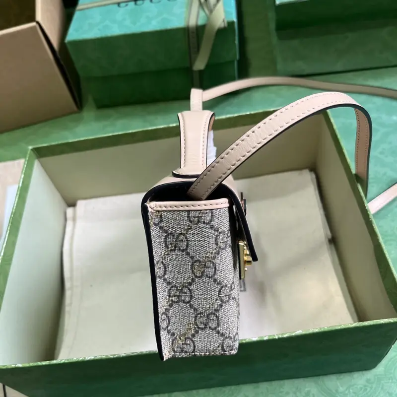 [Includes full original green box packaging] Padlock mini handbag with horsebit print. GG Supreme canvas cleverly incorporates the horsebit stripe pattern, echoing the fabric’s historical origins. This canvas material has been used throughout multiple collections and has become a signature of the brand. The brand’s signature monogram pattern is strikingly embellished on the bag, giving this Padlock mini handbag a timeless appeal. Crafted from beige and ebony horsebit-striped GG Supreme canvas, it features light pink leather trim, gold-tone hardware, and a taffeta lining. Interior: one card compartment, an adjustable leather shoulder strap (55 cm high), and a lock closure. Model No. 774342. Dimensions: 10 cm (length) x 18 cm (width) x 5 cm (depth). Color: Light pink/PVC print.