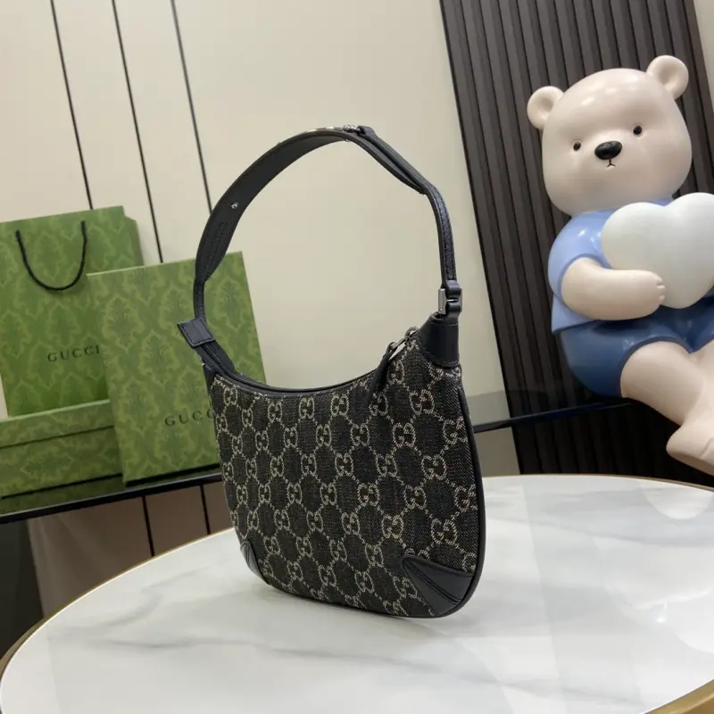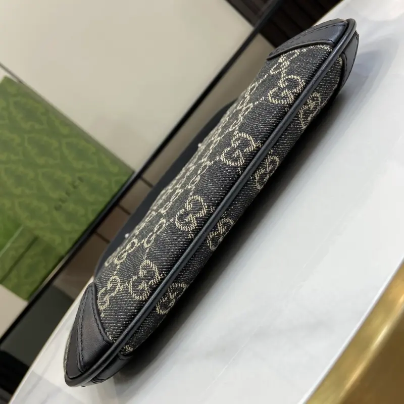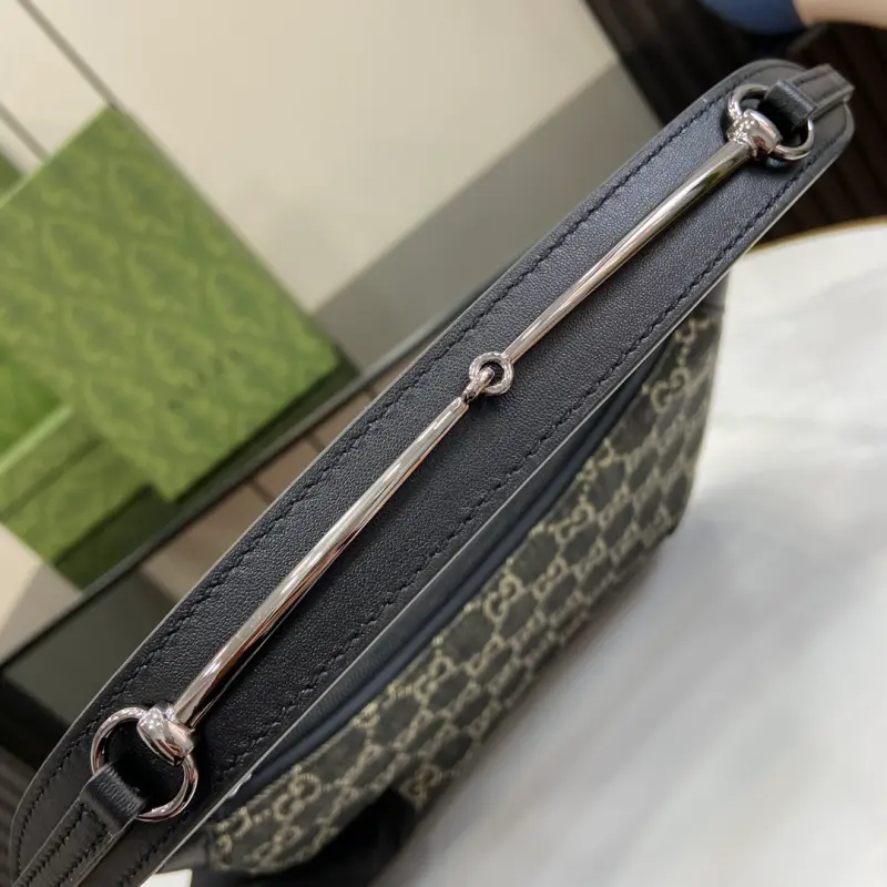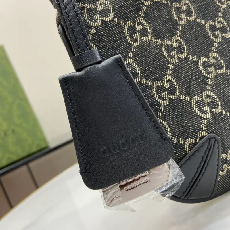 [Includes full original green box packaging] Gbag Horsebit Slim small denim shoulder bag. This Gbag Horsebit Slim shoulder bag is crafted from GG black denim, a new fabric from the Cruise 2024 collection. Silver-tone hardware accents the shoulder strap, creating a metallic finish and creating a beautiful contrast. Black leather trim and a tonal keychain complete the design. Made of black and gray GG denim with black leather trim, this Gbag Tag item is NFC-enabled for an innovative digital experience. It features a silk satin lining, a slim horsebit detail, a leather keychain, and a shoulder strap (20 cm high) with a zipper closure. Model No. 774719. Dimensions: 18 cm (length) x 24 cm (width) x 4.5 cm (depth). Color: Black/Denim Original Leather.