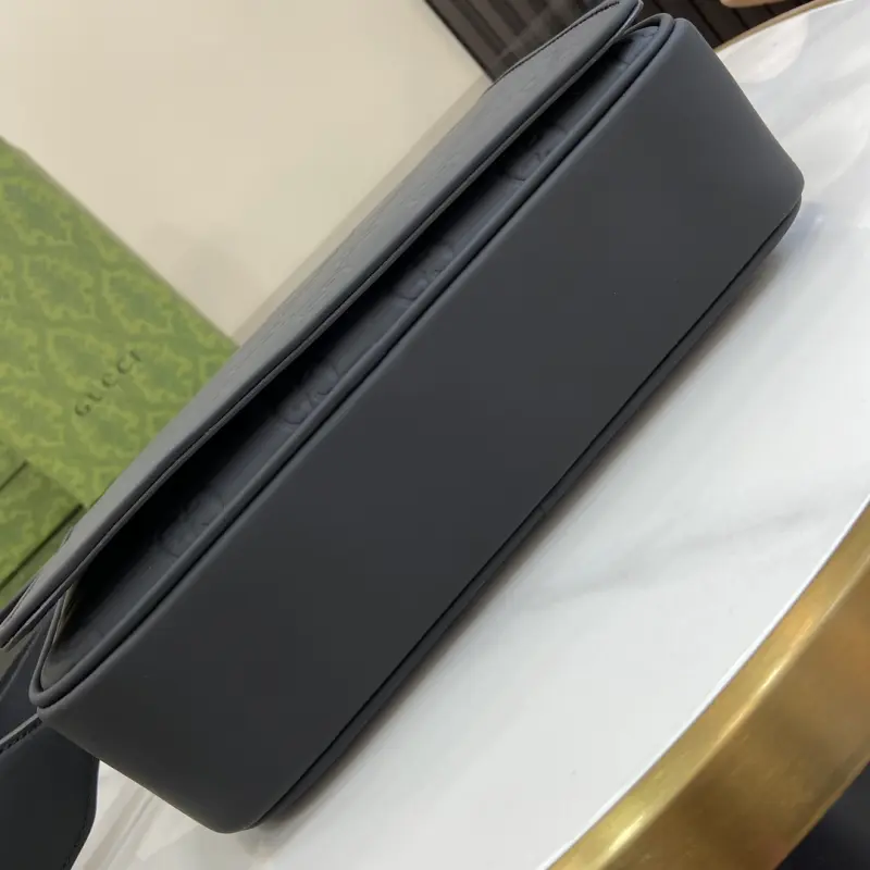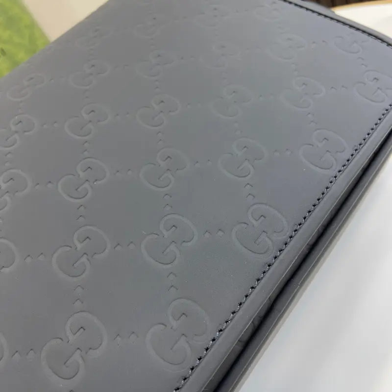 Comes with a complete set of original green box packaging. This GG crossbody bag features a striking collection of black rubber-effect leather, injecting a fresh, modern aesthetic into everyday accessories. This new material, introduced in the Cruise 2024 collection, imbues this crossbody bag with a flap and zipper closure with a modern flair. Made of black GG rubber-effect leather with a cotton and linen blend lining, the interior includes a zippered pocket, an adjustable shoulder strap (adjustable between 66 and 120 cm), and a flap and zipper closure. Model No. 775097. Dimensions: 19 cm (length) x 26 cm (width) x 7 cm (depth). Color: Matte Black/Original GG Embossed Leather.