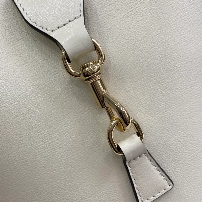 [Comes with a full set of original green box packaging] [New] Mini bucket shoulder bag. This mini bucket shoulder bag is expertly crafted from ivory leather. Featuring a hook closure and a webbing shoulder strap, this accessory cleverly blends functionality and modernity. Ivory leather, light gold-toned metal hardware, red and green webbing shoulder strap, cotton and linen blend lining, zipper pocket with Gbag badge zipper pull, shoulder strap (42 cm high) with hook closure. Model: 782908. Dimensions: 18.5 (length) x 20.5 (width) x 12.5 cm (thickness). Color: White/original leather. Made in Italy.