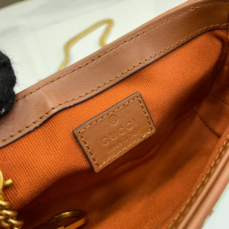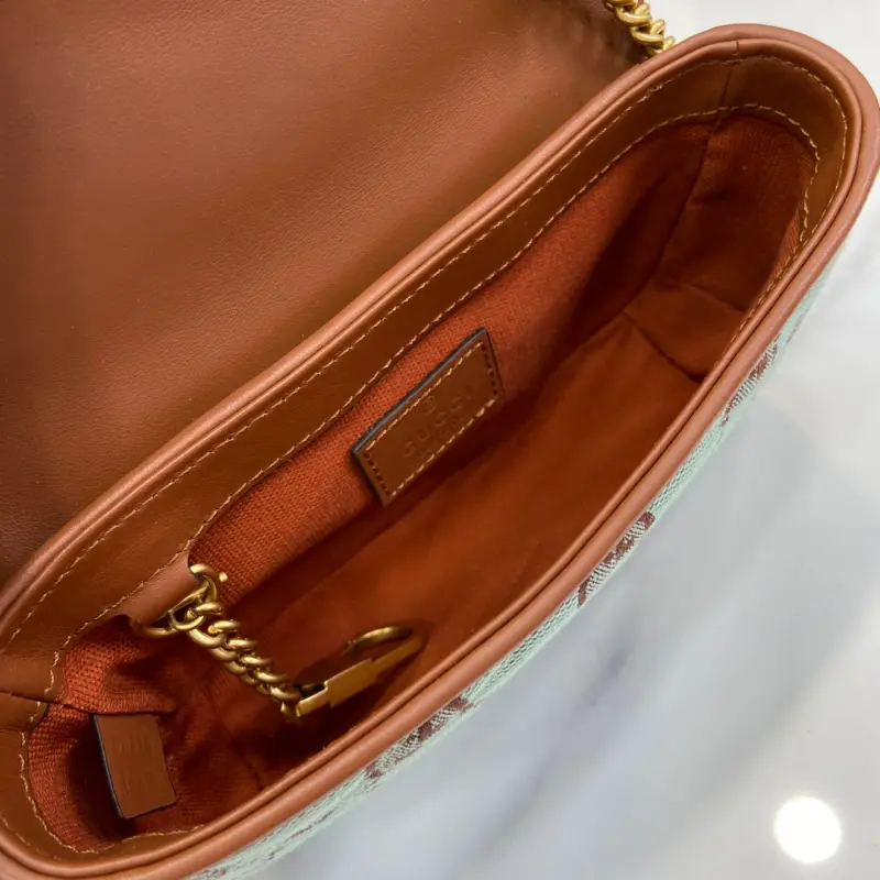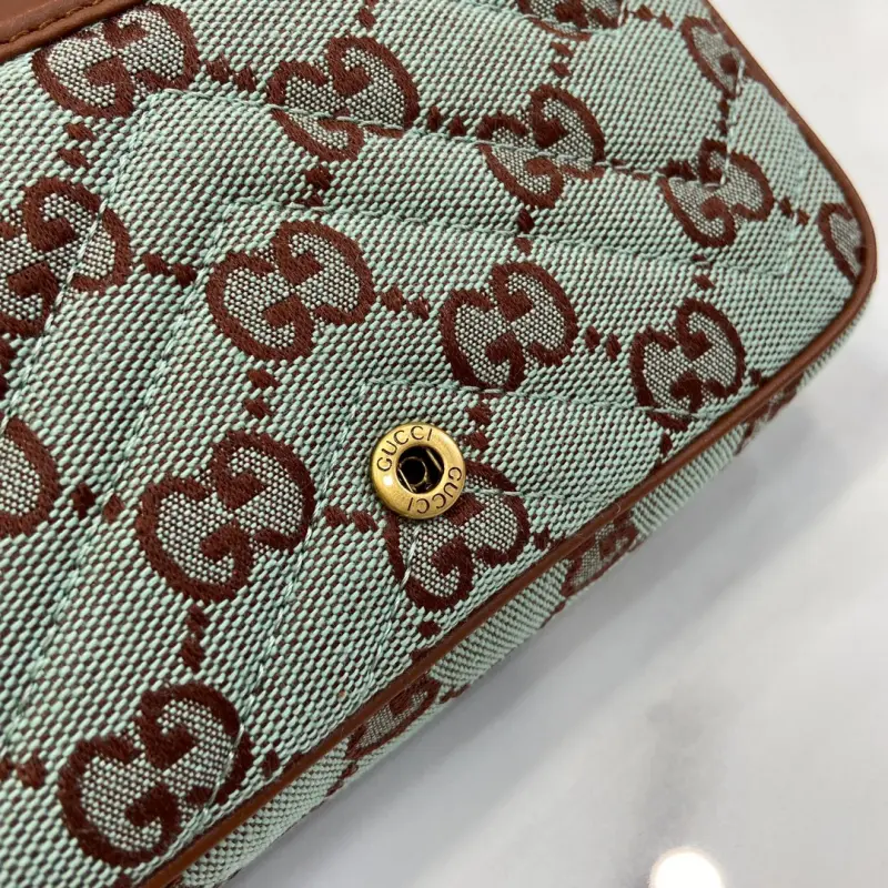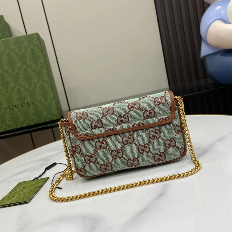 [Includes full original green box packaging] [New Arrival] GG Ultra Mini Shoulder Bag. This piece from the Gbag Lido collection is inspired by the summer spirit and beach clubs of the Italian coast. The new collection of small leather goods features a vibrant color palette, creating a striking new creation. This shoulder bag features a classic silhouette with a clever button closure and an internal hook clasp for attaching a matching wallet or clutch. The new light blue and brown GG canvas complements the brown leather trim, and the Double G hardware adds a touch of elegance. It features light blue and brown GG canvas with brown leather trim, gold-tone hardware, a cotton and linen blend lining, a Double G, an internal hook closure, and a detachable chain shoulder strap with a 57cm drop and a 126cm length. It also has a button placket. Model No. 783141. Dimensions: 16.5cm (width) x 9.5cm (height) x 4.5cm (depth). Color: Brown/Light Blue Canvas.