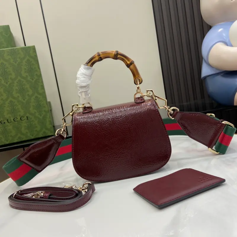 [Includes full original green box packaging] [New Arrival] Gbag Bamboo 1947 Mini Bamboo Handbag. This Gbag Bamboo 1947 handbag features distinctive design elements such as handcrafted bamboo handles, a lock, and a mirror enclosed in a leather case, showcasing the brand’s timeless style and exquisite craftsmanship. Visit selected stores or experience exclusive shopping experiences with a customer service consultant. Red patent leather, gold-tone bamboo hardware, leather lining. Interior: card pocket, web strap length: 81 to 125 cm; leather strap length: 100 to 114 cm, handle drop: 8 cm, web strap drop: 41 to 64 cm; leather strap drop: 50 to 57 cm, bamboo lock closure. Weight: approximately 0.445 kg. Model No. 786482. Dimensions: 17 cm (width) x 12 cm (height) x 7.5 cm (depth). Color: Red Patent Leather/Original Leather. Italian creation