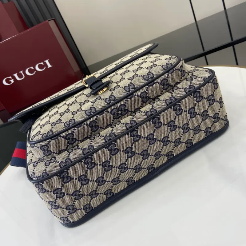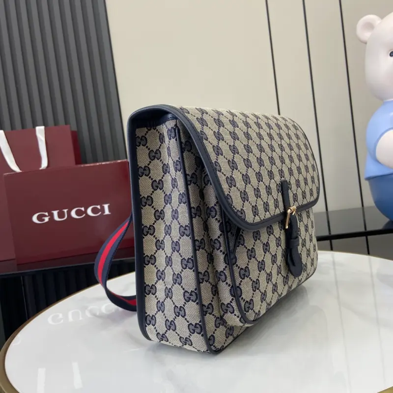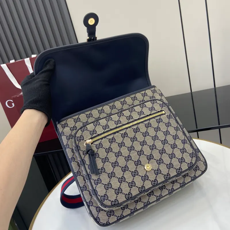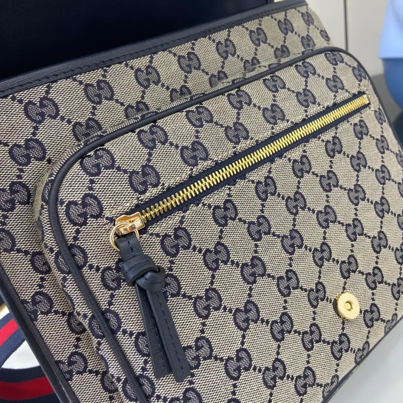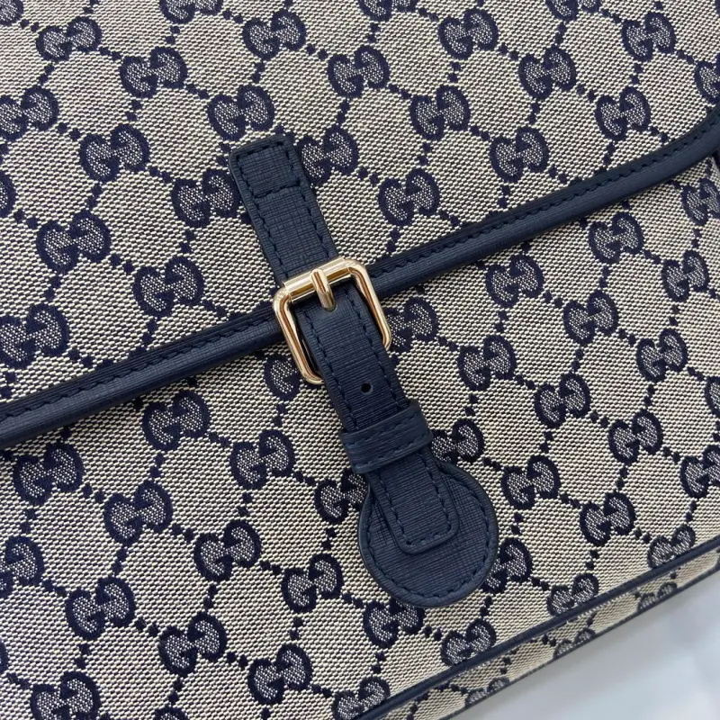 The GG canvas messenger bag for children, featuring the iconic striped webbing, continues to enhance the Gbag children’s collection. Logo details complement the brand’s name, adding a retro, sporty touch to the collection. This structured children’s messenger bag, expertly crafted from classic GG canvas, features a red and blue webbing strap for a unique touch. Model No. 793823. Dimensions: 25 (length) x 29 (width) x 10 (depth). Color: Blue Cloth/Original Leather.