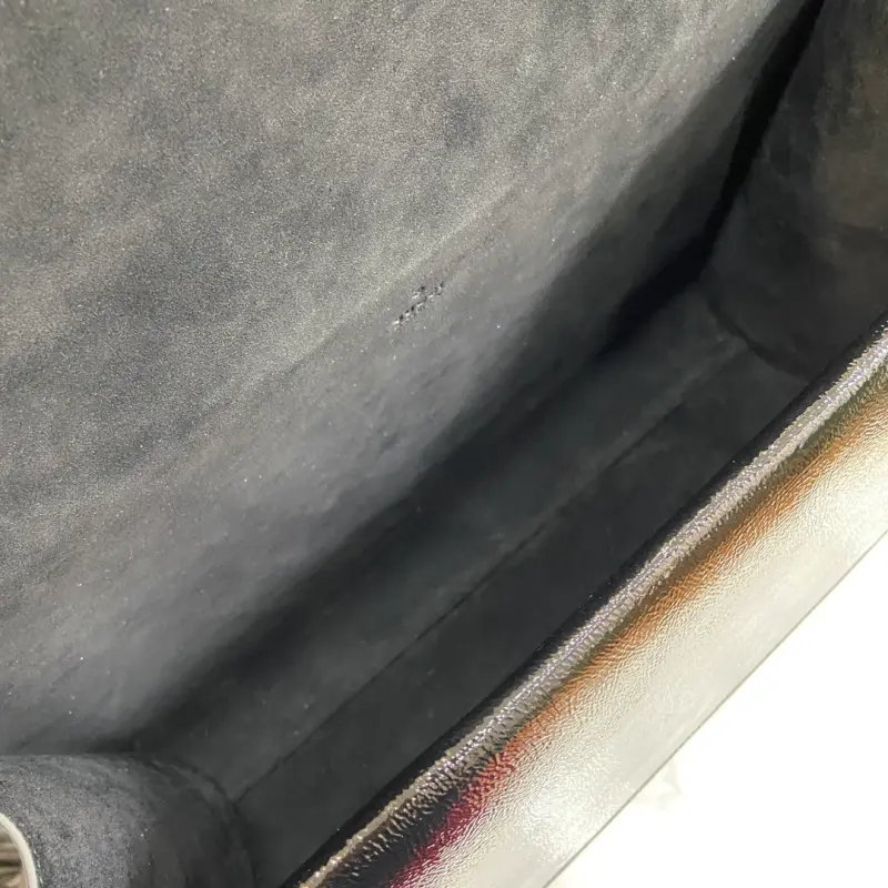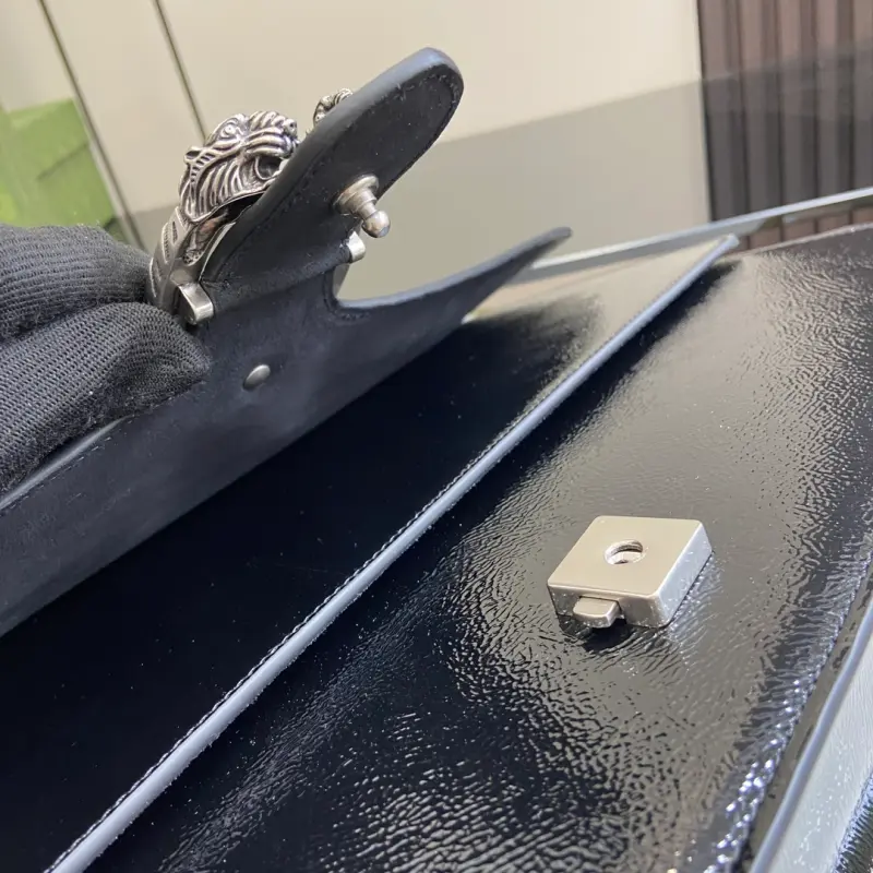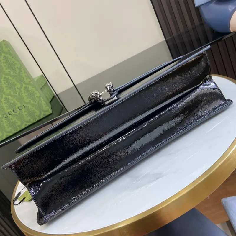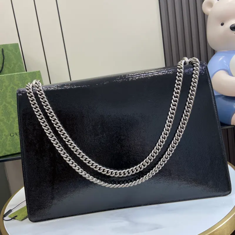 [Comes with a full set of original green box packaging] [New Product] GG Dionysus series large shoulder bag. Gbag Creative Director Sabato de Sarno recreates the classic Dionysus series large-sized shoulder bag. This innovative work is made of fashionable black patent leather, with a double tiger head lock and a flap design. The sliding chain can be freely adjusted to the length, allowing you to create different styles and show a modern style. Black patent leather, silver-tone accessories, the sliding chain strap can be adjusted to a shoulder strap with a height of 26 cm, or a top handle with a height of 43 cm, double tiger head lock, weight: approximately 1.3 kg. Model: 795003. Dimensions: 42 (width) x 28 (height) x 12 cm (depth) Color: black/patent leather original leather. Made in Italy