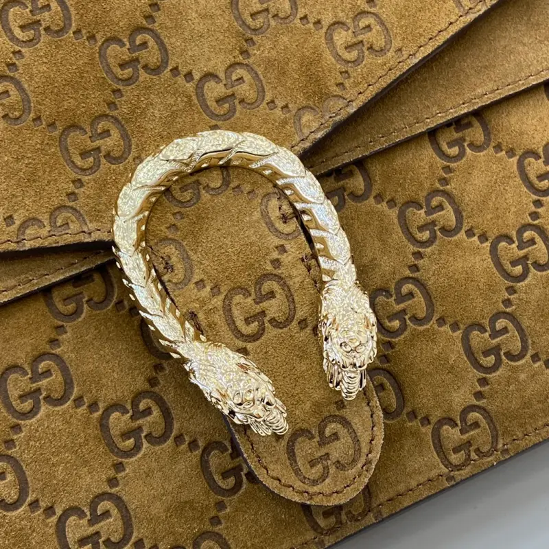 [Comes with a full set of original green box packaging] [New product] Gbag Creative Director Sabato de Sarno recreates the classic Dionysus series large shoulder bag. This handbag is made of brown GG suede material, with a tiger head lock and a flap design. The sliding chain can be freely adjusted to the length to create different wearing styles. Brown GG suede material Light gold tone accessories Brown leather lining Interior: 2 main compartments and 1 flap open pocket Sliding chain strap can be adjusted to a shoulder strap with a height of 43 cm, or a top handle with a height of 26 cm Double tiger head lock Weight: approximately 1.3 grams Model: 795003. Dimensions: 42 cm (width) x 28 cm (height) x 12 cm (depth) Color: Brown matte embossed/original leather Italian creation