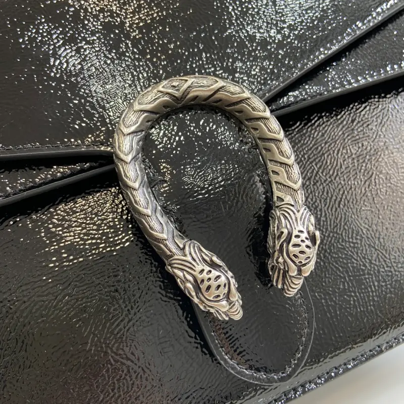 [Comes with a full set of original green box packaging] [New product] GG Dionysus series medium handbag. Gbag Creative Director Sabato de Sarno has created a new masterpiece for the classic Dionysus series. This handbag is made of fashionable black patent leather, showing a modern style. The front is decorated with a classic double tiger head lock, with a flap design, and the sliding chain can be freely adjusted in length to create different styles. Black patent leather, silver-tone hardware, handle (11 cm high) detachable leather shoulder strap (adjustable between 51.5 cm and 55 cm) double tiger head lock. Model: 795007. Dimensions: 29 (width) x 20 (height) x 10.5 cm (depth) Color: black/patent leather original leather. Made in Italy