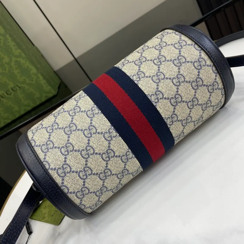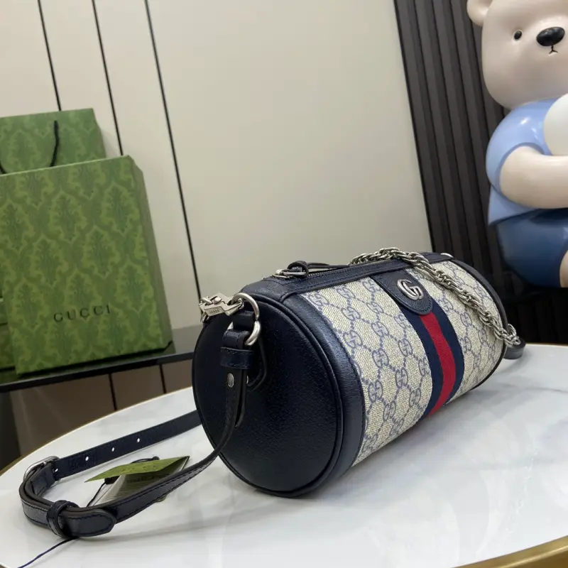 This small Ophidia shoulder bag, crafted from GG Supreme canvas, offers a fresh take on a classic design. It features two detachable shoulder straps: one chain and one leather, embellished with the signature striped Web design and Double G hardware. The bag is crafted from beige and ebony GG Supreme canvas with blue leather trim, gold-tone hardware, a red and green striped Web, and a Double G with a beige cotton and linen lining. It also features a detachable chain shoulder strap with a 22cm drop and a detachable, adjustable leather shoulder strap, adjustable between 50cm and 57cm. Zip closure. Model No. 795194. Dimensions: 241x212cm. Color: Blue/PVC.