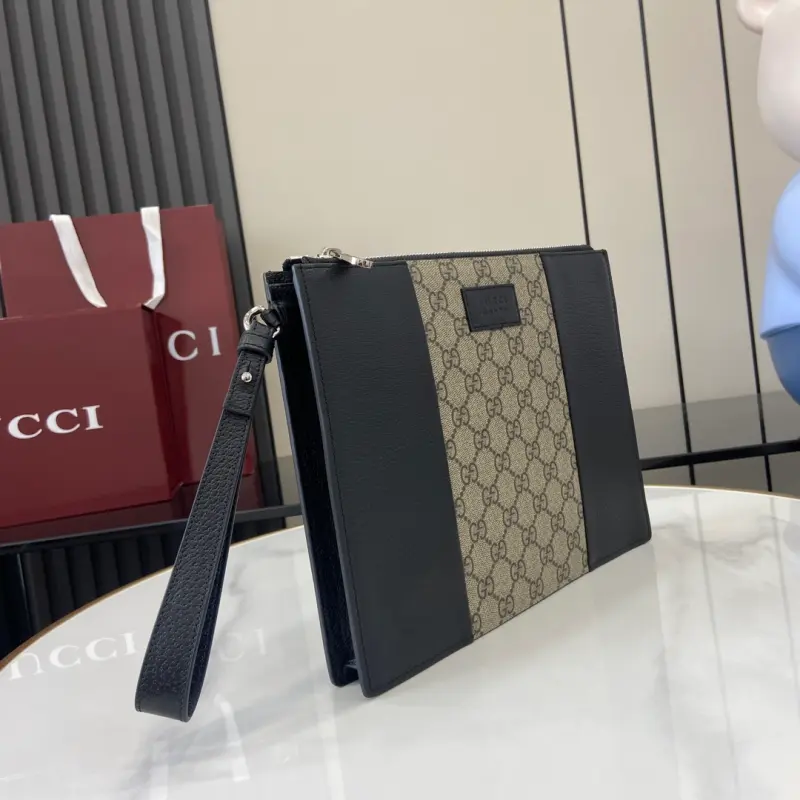 [New] Gbag’s latest GG Supreme PVC and pig-patterned leather clutch. Model: 795487. Dimensions: 28cm (length) x 22cm (width) x 3cm (thickness). Color: brown leather/black. Made in Italy.