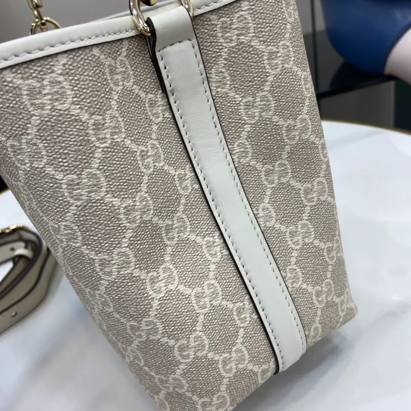 [Comes with a full set of original red box packaging] [New Product] The new GG Emblem series reinterprets the brand’s timeless elegance and exquisite craftsmanship. This mini bucket bag features an internal compartment, which is stylish yet practical. Beige and white new GG letter pattern coated fabric, off-white leather piping, decorated with contrasting stitching hook closure handle; 14 cm high and equipped with a D-shaped ring for hanging detachable items. Interior: 2 compartments and 1 central snap compartment. Removable and adjustable leather shoulder strap (52 cm – 57.5 cm high); the length can be adjusted between 107 cm and 114 cm. Magnetic snap closure model: 815118. Dimensions: 19 cm (width) x 18 cm (height) x 11 cm (depth) Color: Beige rubber beige white leather/original leather. Weight: approximately 0.45 kg Made in Italy