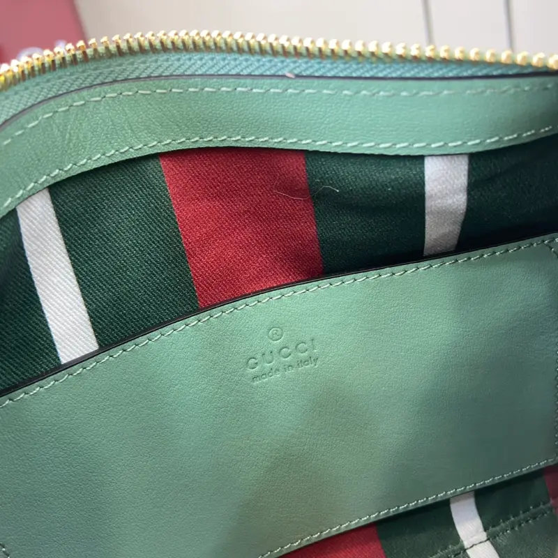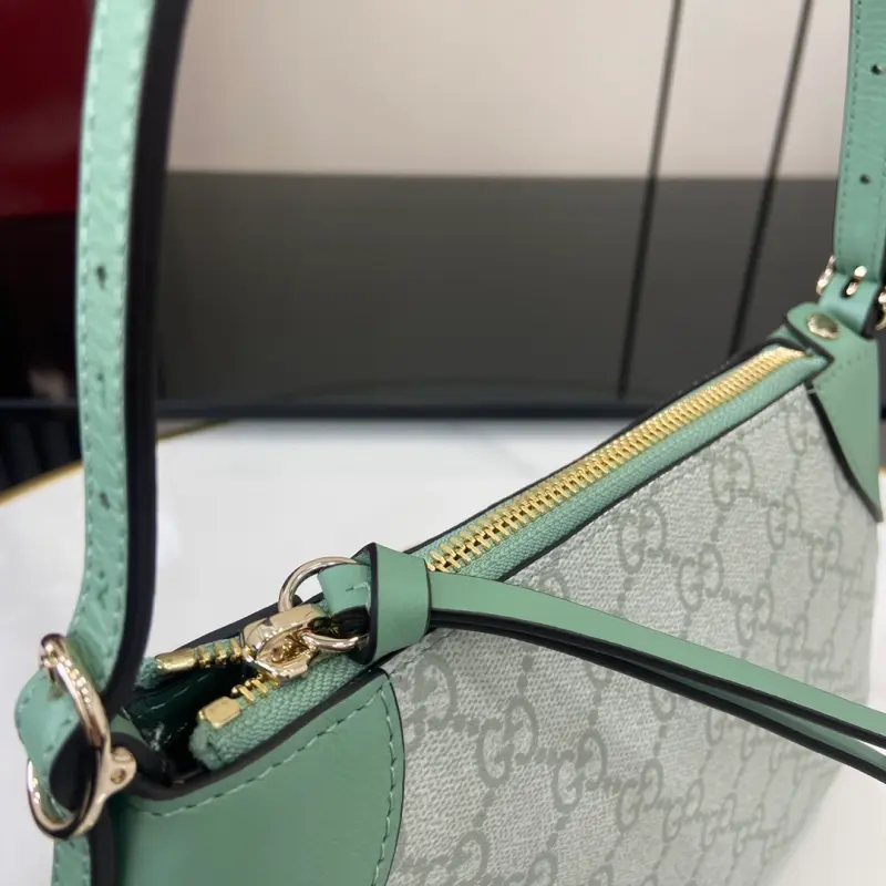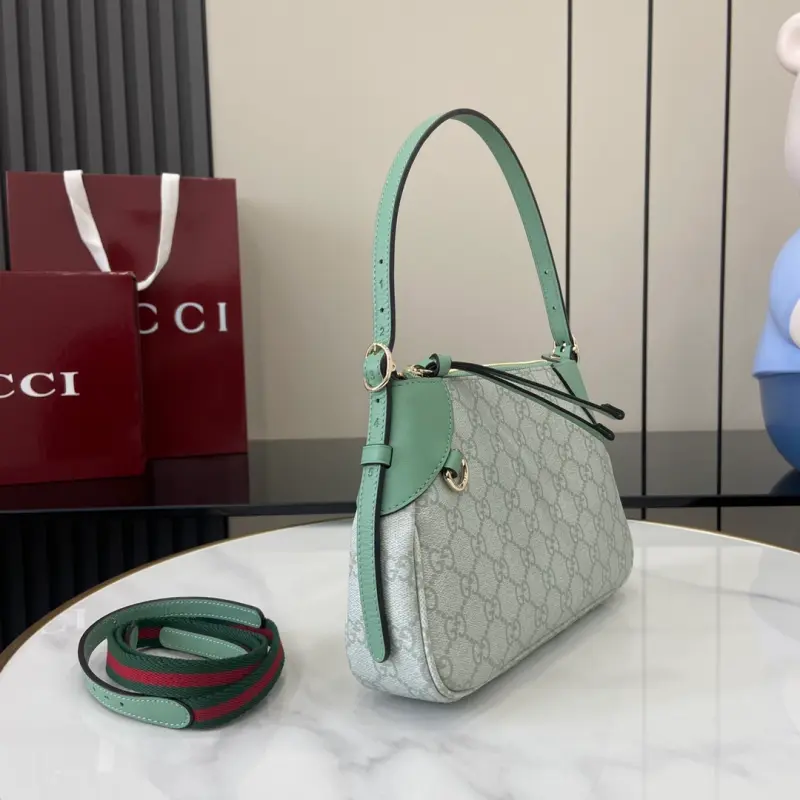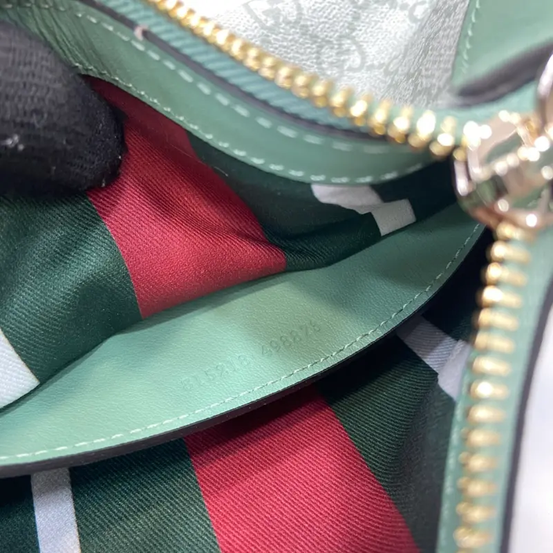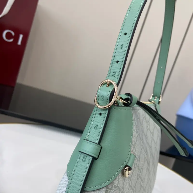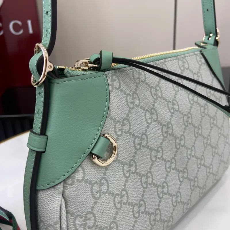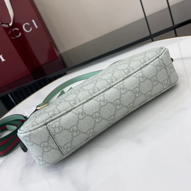 [With a full set of original counter packaging][New product] The new GG Emblem series reinterprets the brand’s timeless elegance and exquisite craftsmanship. This small shoulder bag features an adjustable shoulder strap decorated with number eyelets, inspired by the equestrian world. Gray-green GG Monogram coated fabric, gray-green piping, leather piping, light gold-tone hardware, red and green web cotton lining, and a D-ring for hanging detachable items, decorated with number eyelets. Adjustable handle; height 16 cm – 27 cm. Interior: one open pocket, adjustable leather shoulder strap (height 47 cm – 57 cm). Zipper closure model: 815218. Dimensions: 24.5 cm (width) x 16 cm (height) x 5 cm (depth). Weight: approximately 0.25 kg. Color: gray-green pvc/original leather. Made in Italy