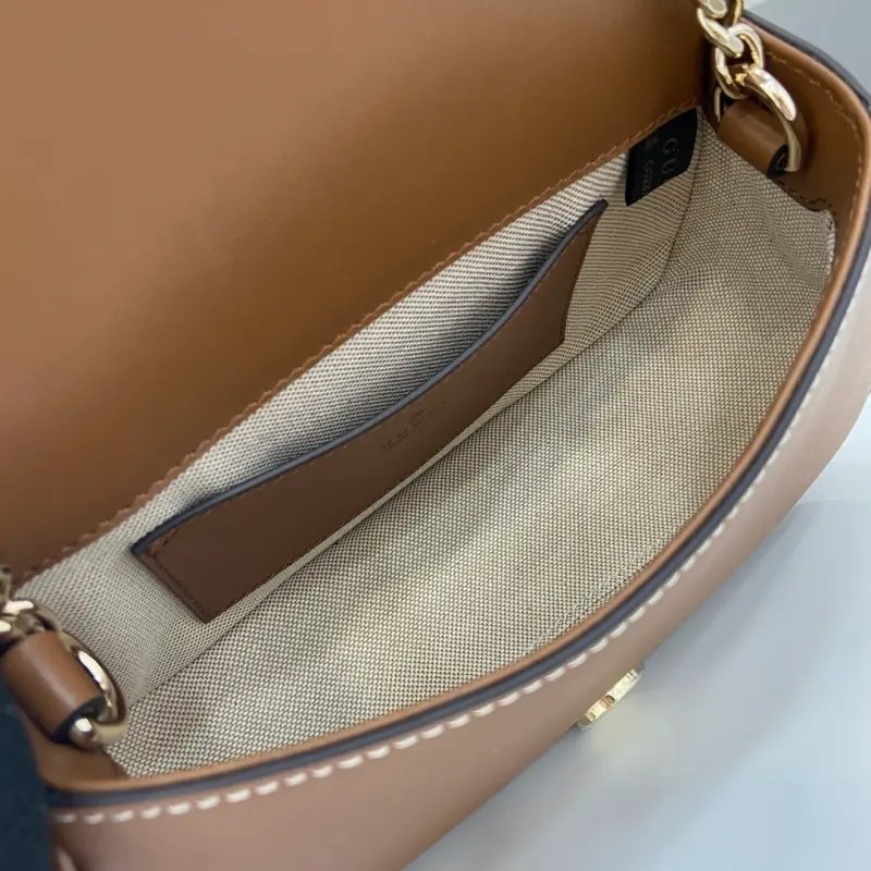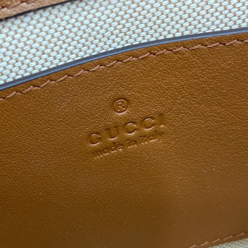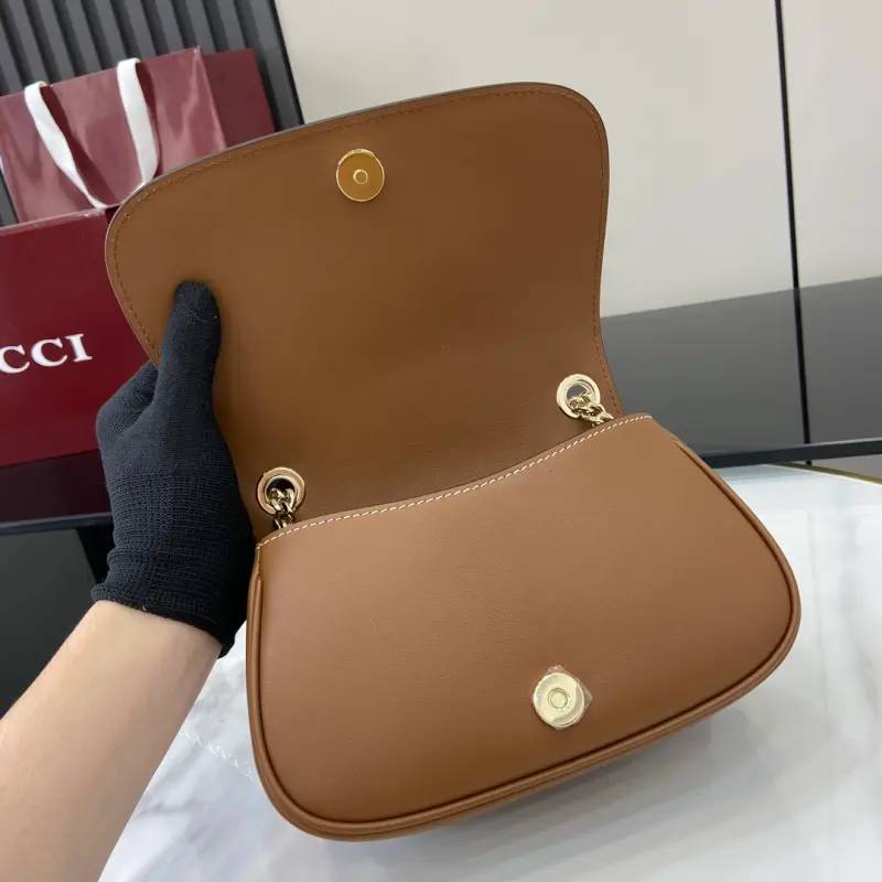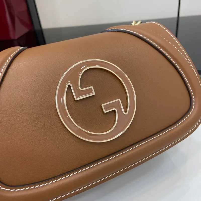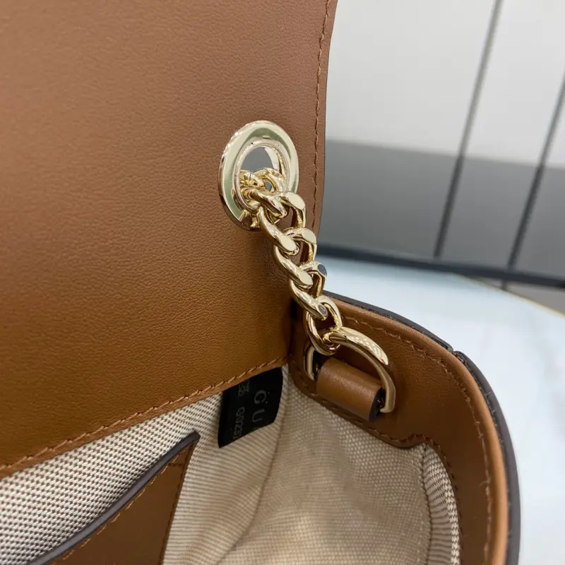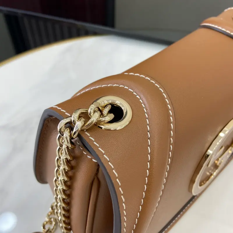 [Includes full original green box packaging] [New] Gbag Blondie Series Mini Shoulder Bag. The new Gbag Blondie series handbag is adorned with the brand’s classic logo that debuted in the early 1970s. It cleverly combines heritage charm with contemporary style, and perfectly interprets the brand’s classic design and modern essence. This mini shoulder bag is made of Gbag Ancora red leather, with an enameled brand circular logo and a gold-tone chain shoulder strap. Model: 815711. Dimensions: 21.5 (length) x 11 (width) x 8 (thickness). Color: Brown full leather/original leather. Made in Italy