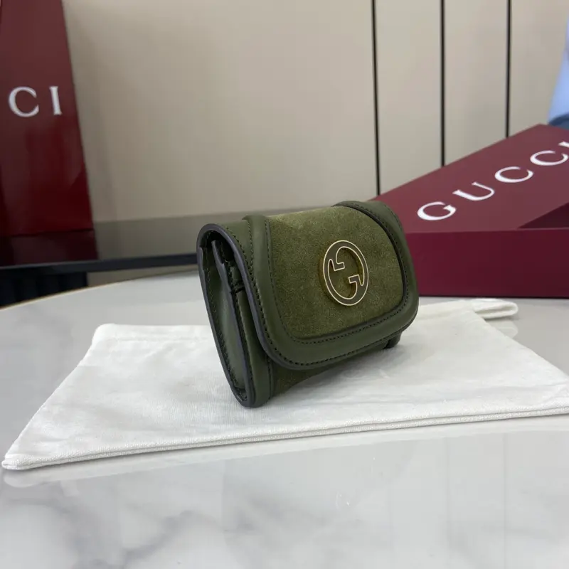[Comes with a full set of original counter packaging][New product]The circular interlocking double G logo draws inspiration from the brand’s collection elements, and as always, it adds color to green nubuck cowhide accessories. On this green nubuck cowhide card holder, this 1970s style logo once again shines with charm. The interior is carefully equipped with multiple compartments to meet various uses. Green nubuck cowhide taffeta lining enamel circular interlocking details Interior: card compartment, 1 coin compartment Snap button closure Model: 818795. Dimensions when open: 22 cm (width) x 9 cm (height); Dimensions when closed: 11 cm (width) x 9 cm (height) Weight: approximately 80 grams Color: green nubuck leather/original leather. Made in Italy