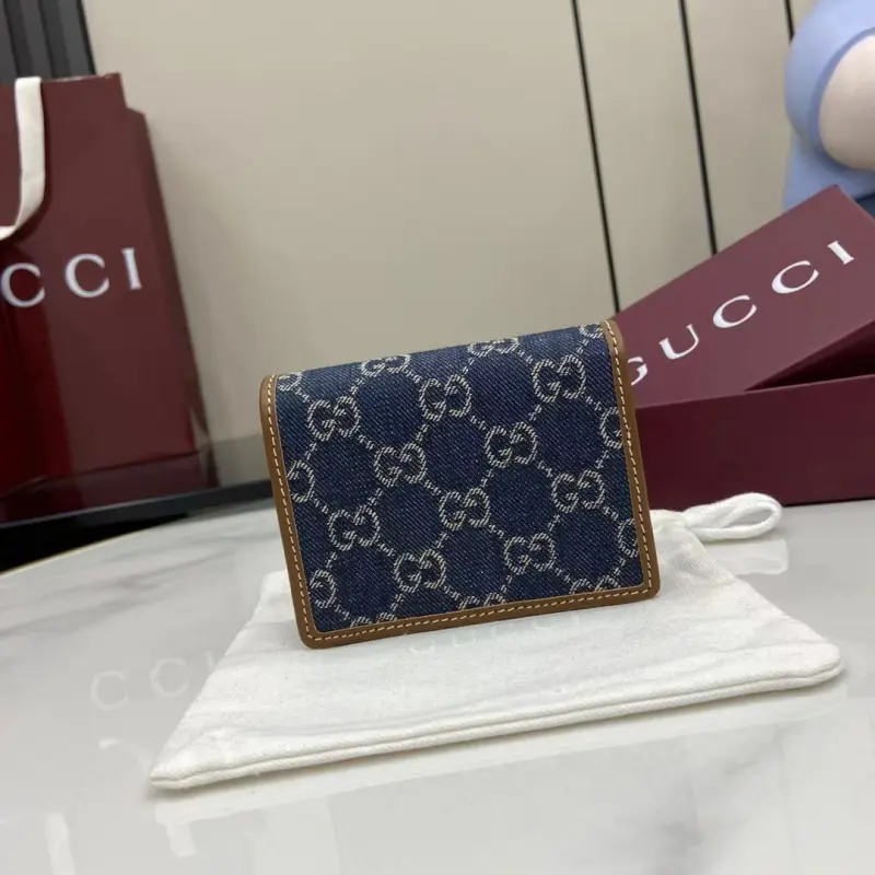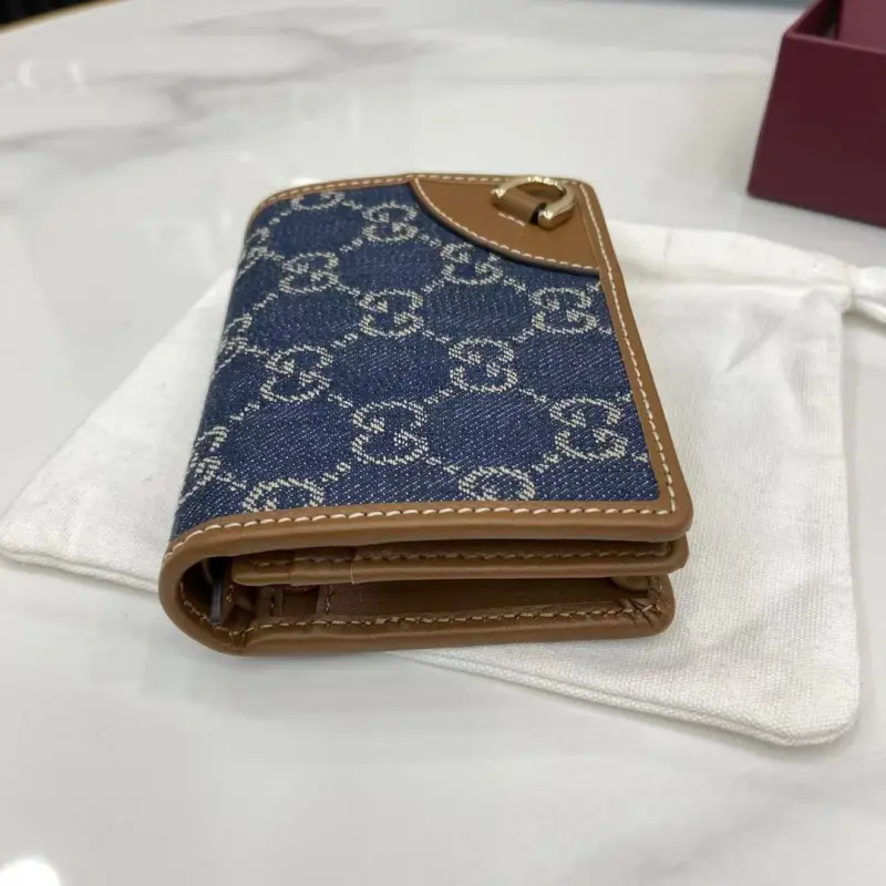 [With a full set of original counter packaging][New Product]The new GG Emblem series reinterprets the brand’s timeless elegance and exquisite craftsmanship. This blue and ivory mini wallet is crafted with GG denim. Carefully arranged with multiple compartments, cleverly integrated with practical snap closures. Blue and ivory GG denim fabric, brown leather piping, equipped with a small D-ring taffeta lining, interior: 5 card compartments, 1 open pocket, 1 zipper pocket and 1 banknote compartment, snap closure model: 820692. Dimensions when closed: 11 cm (width) x 8.5 cm (height) x 3 cm (depth); Dimensions when open: 11 cm (width) x 17.5 cm (height) Weight: approximately 130 grams Color: blue denim brown/original leather. Made in Italy