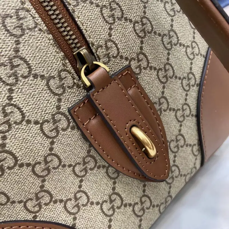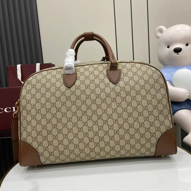 [Comes with a full set of original gift bag invoice] [New Product] The new GG Emblem series reinterprets the brand’s timeless elegance and exquisite craftsmanship. This travel bag is crafted with new beige and dark brown GG letter pattern coated fabric, with a detachable canvas shoulder strap. Beige and dark brown new GG letter pattern coated fabric Brown leather piping Cotton lining Lock and key chain Interior: 1 zipper pocket Handle: 12 cm (height) Detachable canvas shoulder strap (55 cm high); length can be adjusted between 90 cm and 143 cm Zipper closure model: 821148 Dimensions: 47 cm (width) x 31 cm (height) x 25 cm (depth) Weight: approximately 1.85 kg Color: brown glue pvc brown/original leather. Italian creation