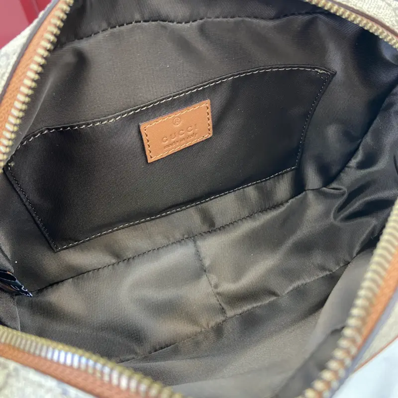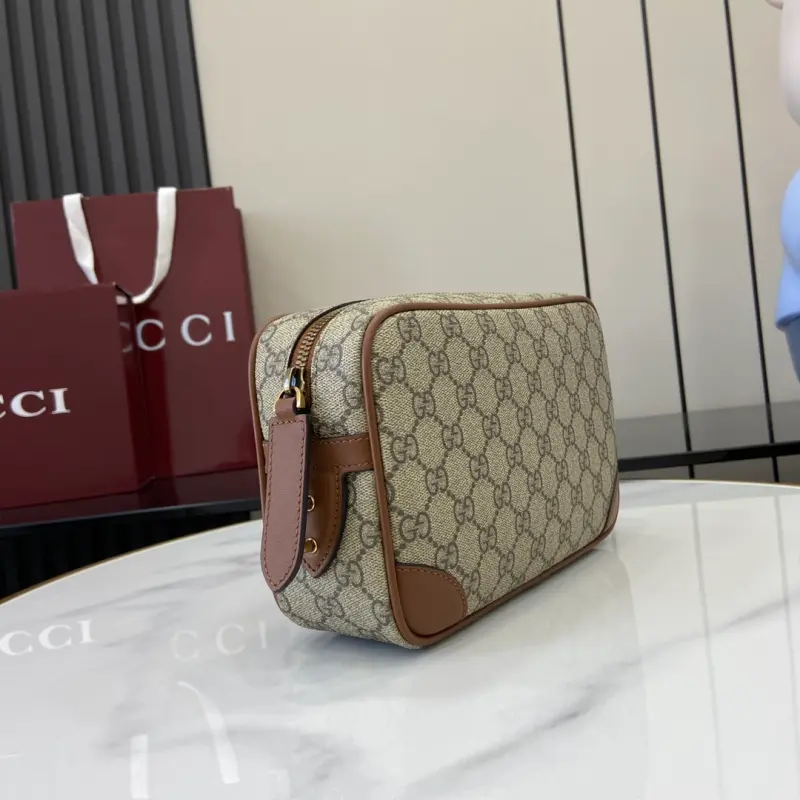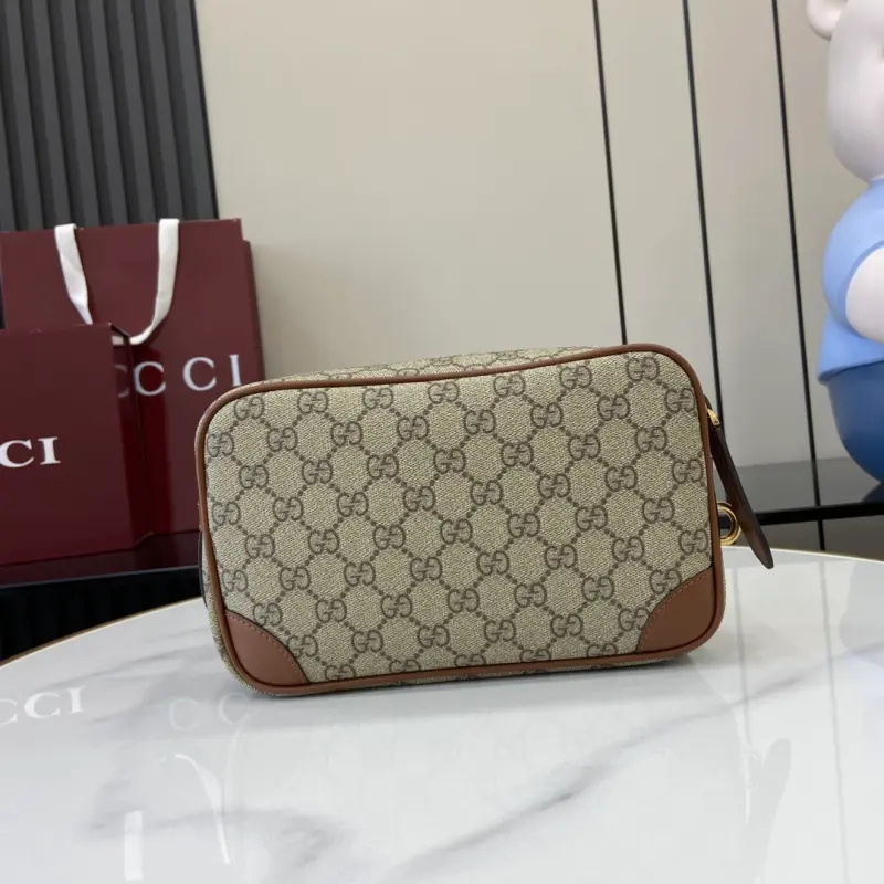 [Comes with a full set of original green box packaging] [New Product] The new GG Emblem series reinterprets the brand’s timeless elegance and exquisite craftsmanship. This toiletry bag is ingeniously crafted with a new brown GG letter pattern coated fabric, with an open pocket and an external D-shaped ring for hanging other accessories. Brown new GG letter pattern coated fabric Brown leather piping Nylon lining Interior: one open pocket Exterior: 1 D-ring zipper closure Model: 821164. Dimensions: 23.5 cm (width) x 15 cm (height) x 6 cm (depth) Weight: approximately 0.3 kg Color: brown pvc/original leather. Made in Italy