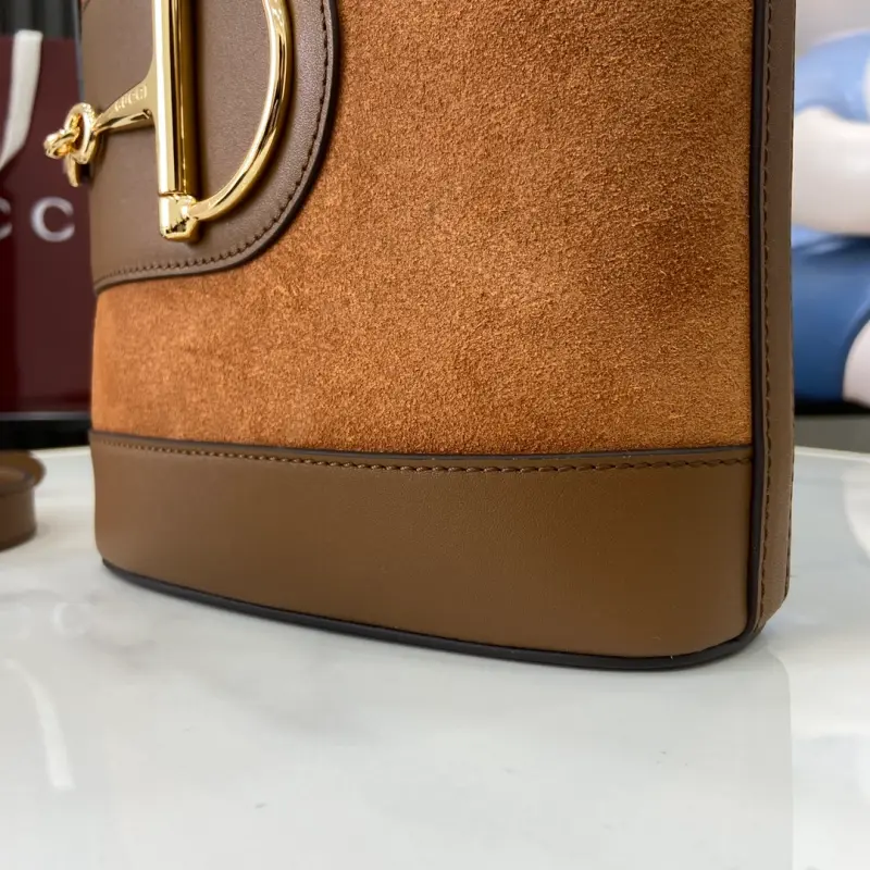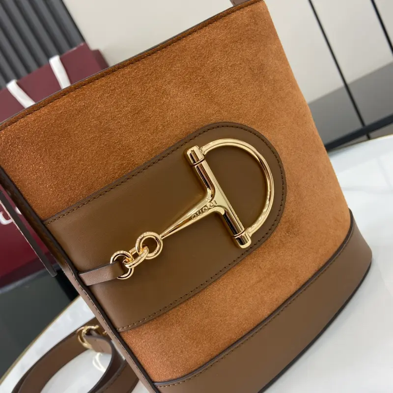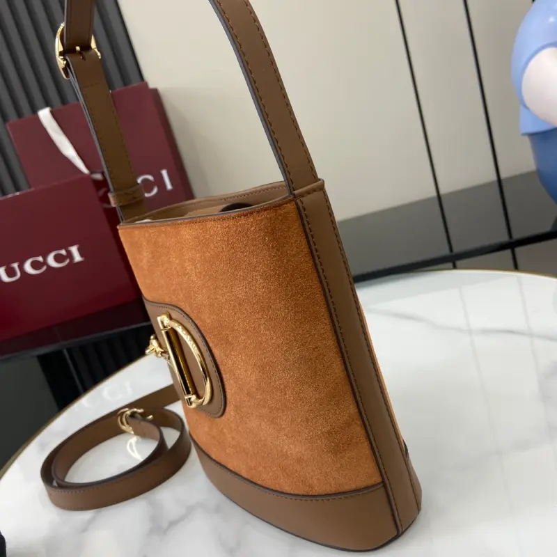 [Comes with a full set of original counter packaging][New product]In the 2025 Spring/Summer series, the Gbag 73 is inspired by the archival bucket bag of the same name year. It uses a contemporary horseshoe buckle hardware design and can be worn crossbody, on one shoulder or as a handbag. Brown nubuck cowhide Brown leather decoration with gold tones, large half spur hardware Brown cotton and linen lining Interior: 1 zipper pocket Shoulder strap (19 cm high) Comes with a detachable bag strap (50 cm high) Magnetic buckle closure model: 833665. Dimensions: 18.5 cm (width) x 20 cm (height) x 8.5 cm (depth) Weight: approximately 0.5 kg. Color: Brown nubuck/original leather. Italian creation