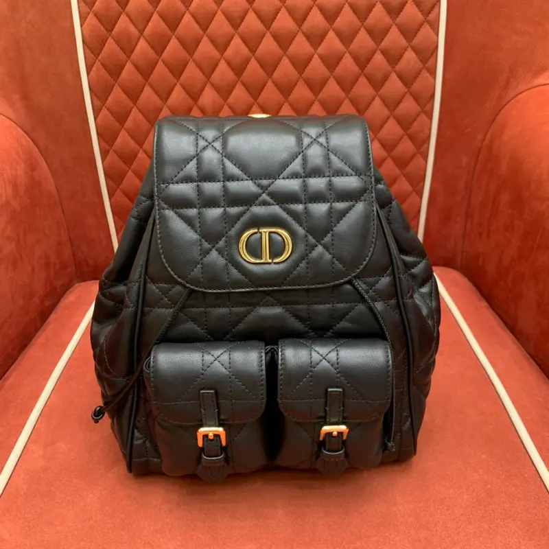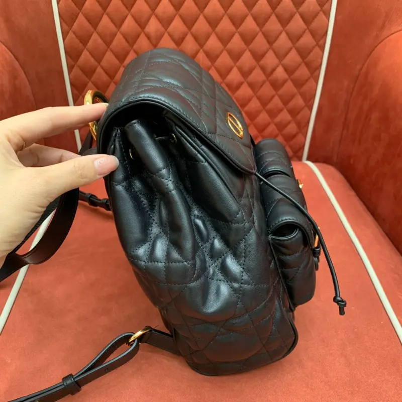 The Caro 2025 Early Spring Backpack is crafted from medium-sized black lambskin, a delicate and soft material. Its understated black and gold color scheme makes it incredibly timeless! Oversized rattan-patterned topstitching elevates the design, while the flap features a vintage gold-finished metal CD logo. Opening the flap reveals a drawstring main compartment, a small flap pocket for everyday essentials, and a gold-finished handle and adjustable shoulder strap for added comfort. Dimensions: 23x27x12.5cm