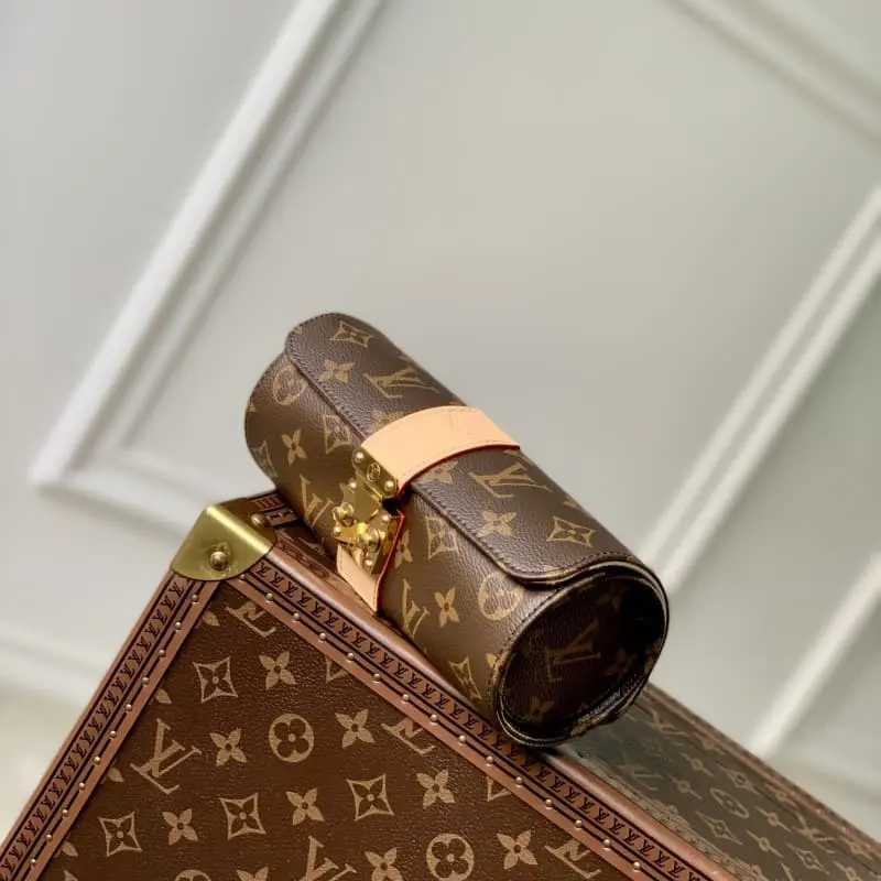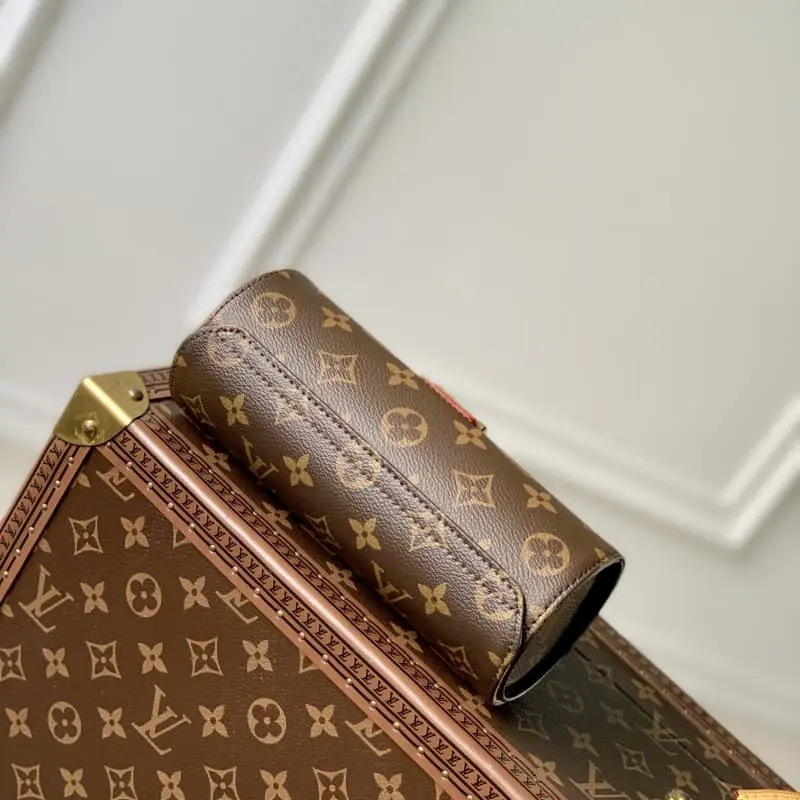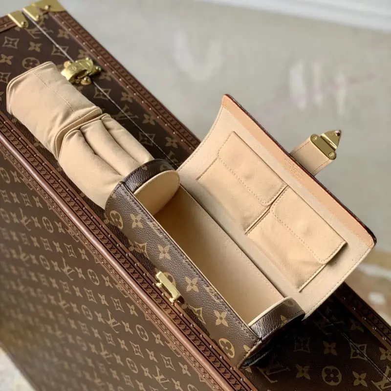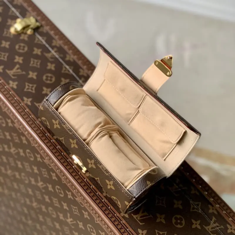 M10145 The “Etui Bijou” with leather trim on the monogram canvas gives a sophisticated impression. It has a compact size and excellent storage capacity. There are 2 buttoned pockets and 2 cushions with slots on the inside to safely store necklaces, watches, rings, bracelets, and earrings. The gold S-lock clasp creates an elegant and feminine atmosphere. 19 x 8 x 8 cm.