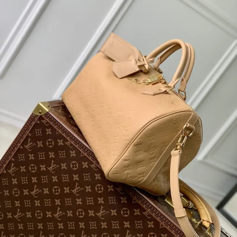M11323 Apricot (full leather) This Speedy Soft 30 handbag renews the classic design of the Speedy handbag with Monogram Empreinte leather and suede cow leather lining to create a light and soft configuration. Whether it is hand-held, cross-body or shoulder-carried, it can create a trendy look. Size: 21 x 17 x30 cm (length x height x width)