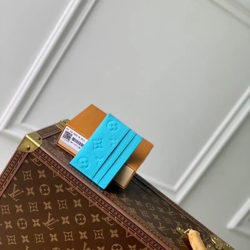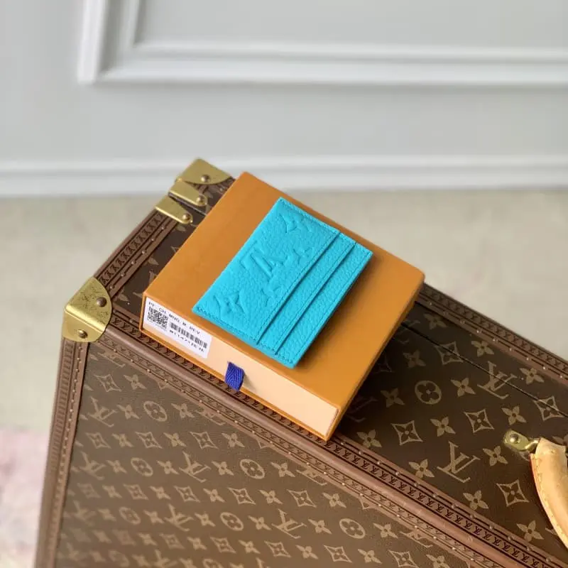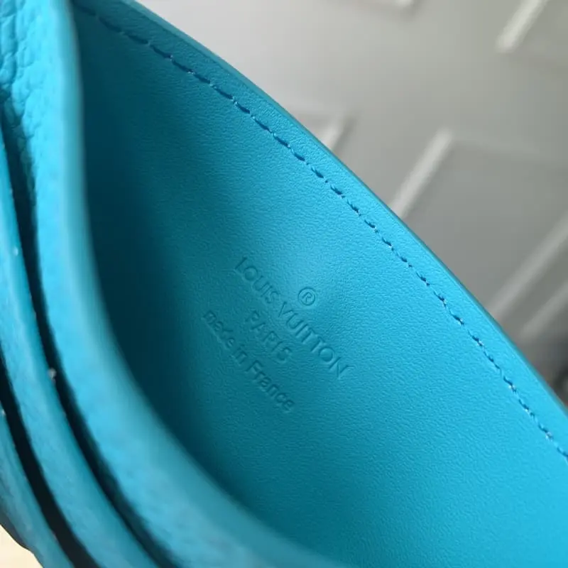 M11471 Embossed This double card holder made of Monogram Eclipse reverse canvas has four slots for credit, business or shipping cards and a central pocket for receipts and small papers. This clean model is embellished with a strip of turquoise leather on the top. This accessory fits in all pockets. 11 x 7 x 1.5 cm