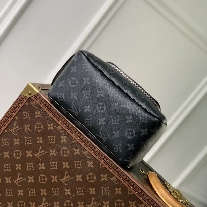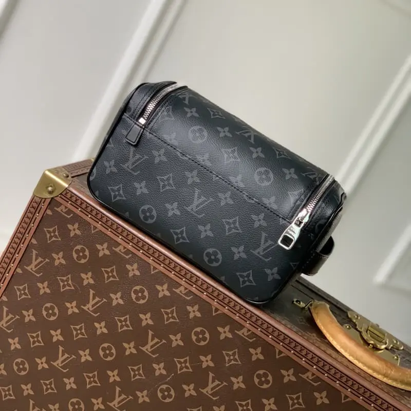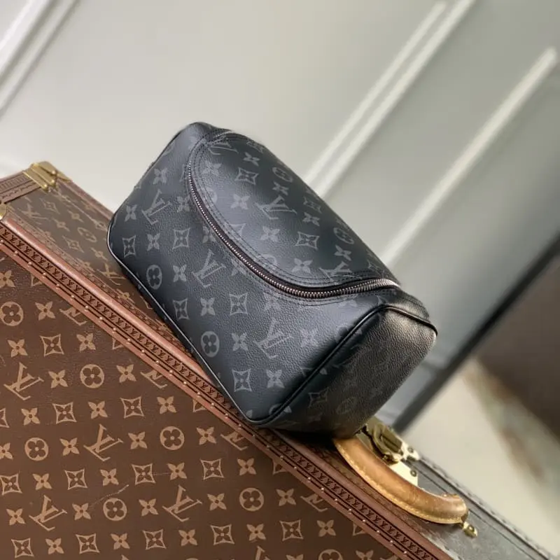 M11510 Black Flower Toiletry Bag This toiletry bag is made of Damier Graphite canvas with a rugged feel. The practical elastic lining keeps bottles upright. Damier Graphite canvas Cotton lining Leather trim Silver-tone metal hardware, wide zipper closure, one zippered inner pocket Dimensions: 26 x 14 x 12 cm