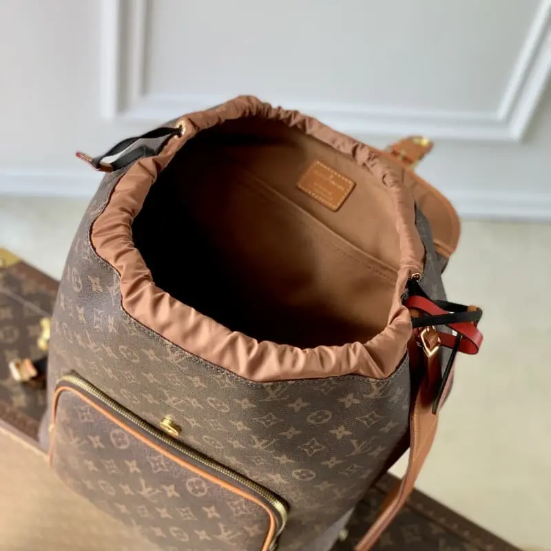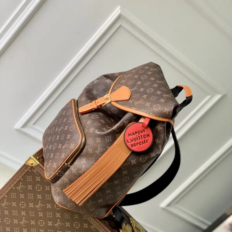 M11540 This Montsouris backpack is from Pharrell Williams’s 2024 Fall/Winter collection themed “From Paris to Virginia”. It is made of Monogram Dust canvas with distressed cowhide trims and Marque L.Vuitton D??pos??e decorations and a non-functional tassel name tag. The top handle and shoulder strap allow for multiple carrying options. 32 x 40 x 19 cm (length x height x width)