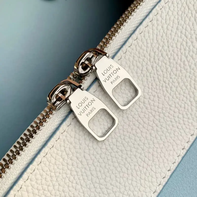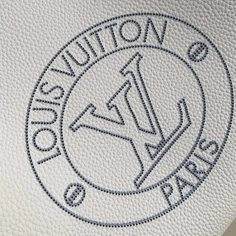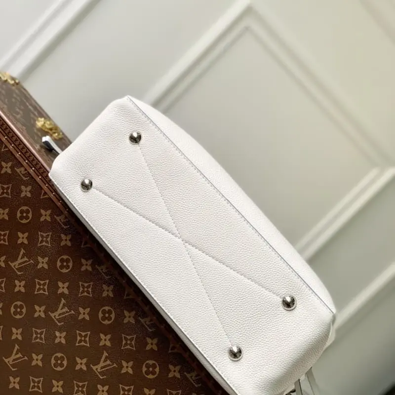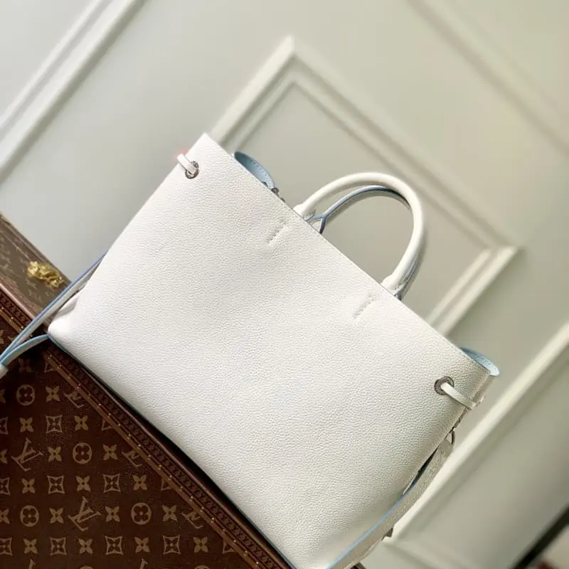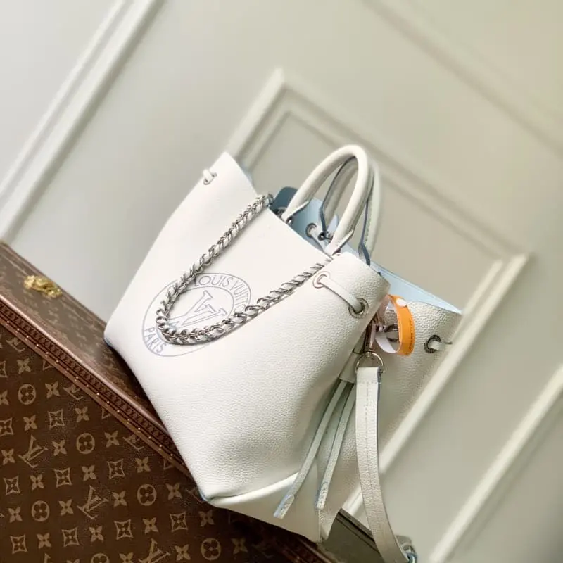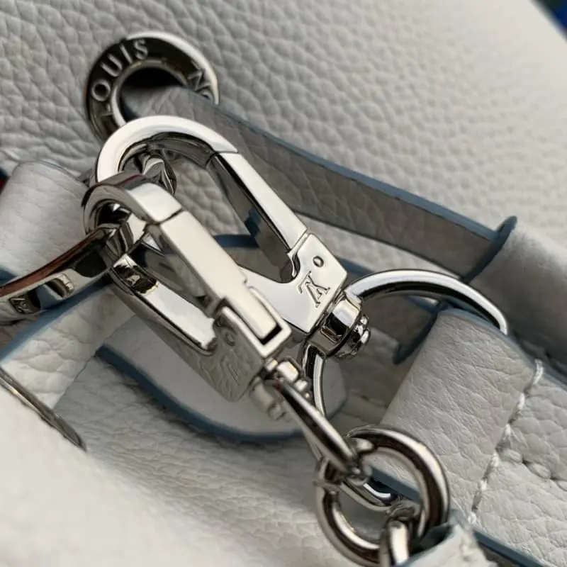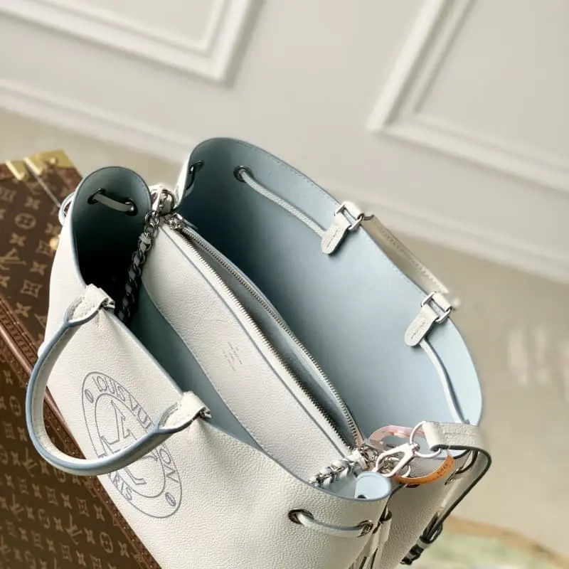 M11733 The spacious Bella bag in Mahina perforated lambskin in a striking white-blue colour is part of the Aura collection. The LV ring motif is reminiscent of classic brand designs while the silver hardware (including a detachable chain) lends a sense of casual sophistication. The spacious interior features two compartments with a zip pocket between the compartments. 32 x 23 x 13 cm (length x height x width)