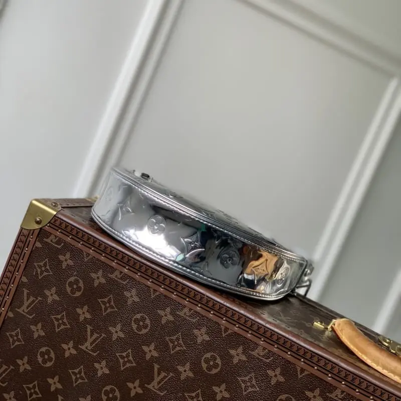 M11833 Silver This small Loop bag is from the LV Ski collection. Inspired by the brand’s classic metal hard case from 1892, the Monogram embossed coated canvas is rendered with a Monogram Miroir effect, giving traditional aesthetics a retro-futuristic feel. The adjustable leather shoulder strap and chain are both detachable, making it a flexible choice for storing personal items and long wallets when traveling day and night. Dimensions: 23.0 x 13.0 x 6.0 cm (length x height x width)