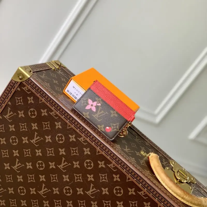 M12215 Monogram/Red (Silkscreen-Christmas) This LV Charms card holder is from the Candy Factory series. Invite the brand mascot to spend a wonderful holiday season. Monogram canvas depicts the joyful scene of Vivienne wandering in colorful candies. Vivienne shape decoration and LV floral rich details. Size: 7.3 x 0.3 x 10.2 cm