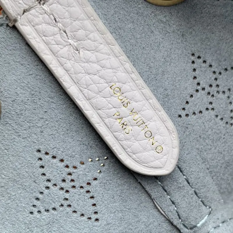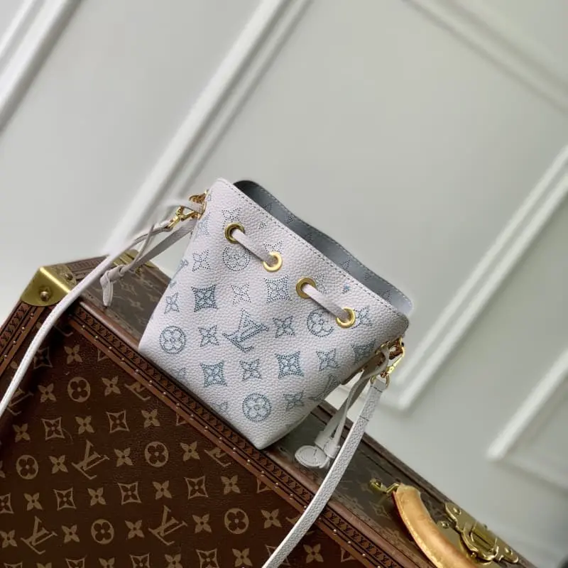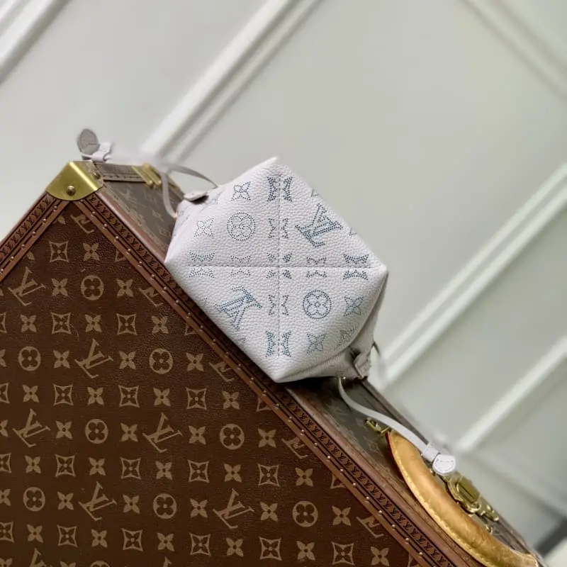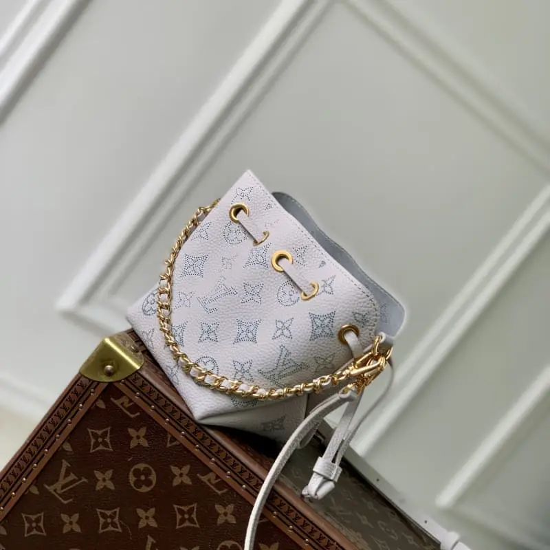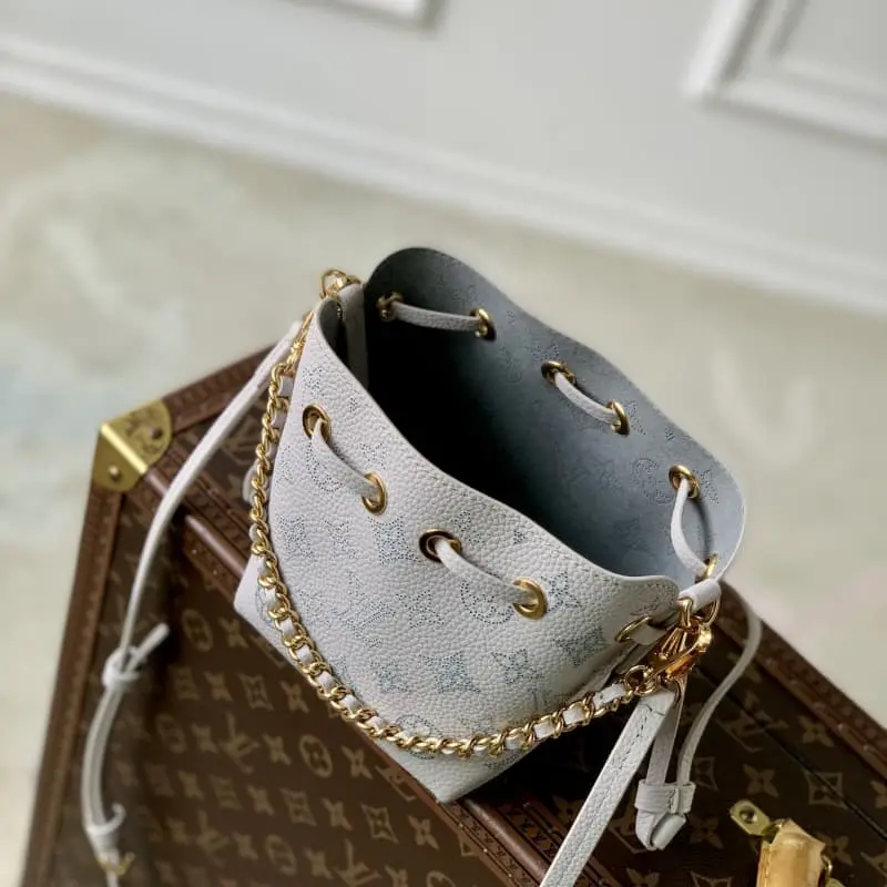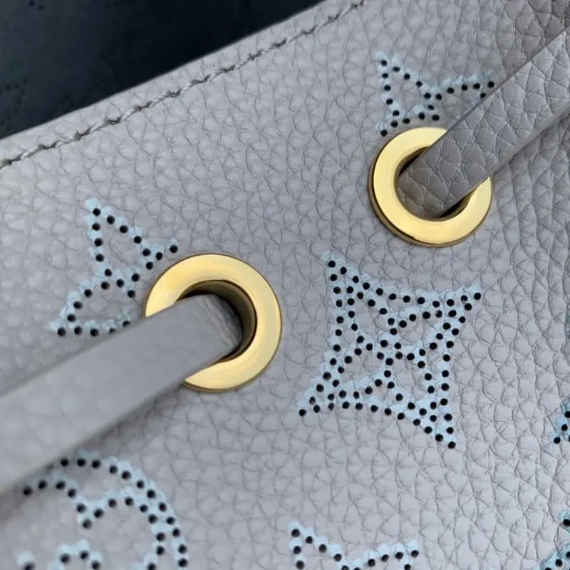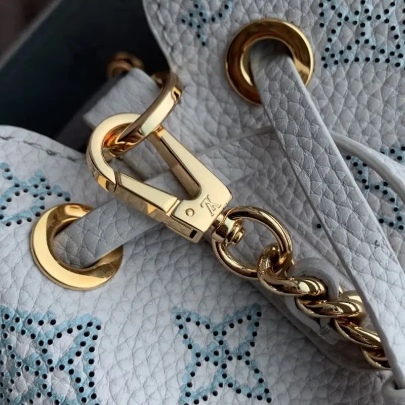 M12521 This Pico Bella handbag is made of perforated leather and features LV letters and Monogram flowers. The smooth leather drawstring allows for easy access and the detachable chain and shoulder strap allow for a variety of carry options. 10.5 x 13 x 11 cm (length x height x width)