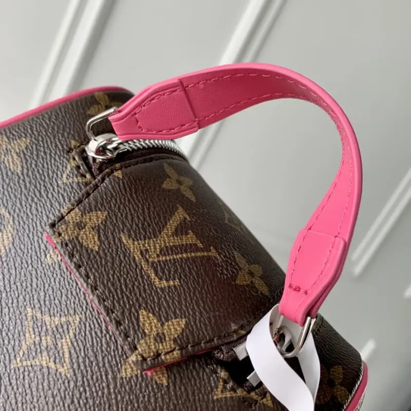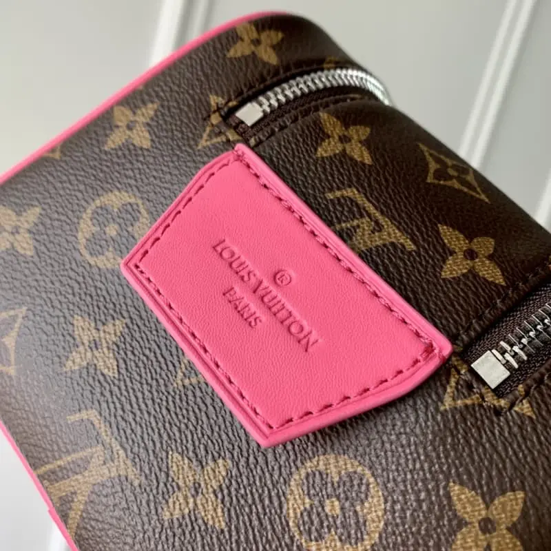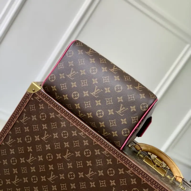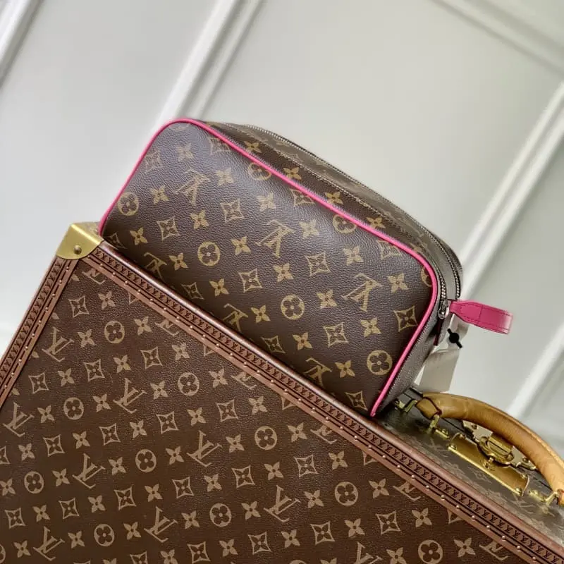 M12641 Rose Red This Dopp Kit is made of fine-grained Taurillon Monogram leather and is an elegant way to carry toiletries and other personal items. This spacious bag features a double zipper closure and washable lining, combining style and functionality. This accessory makes a thoughtful gift or complements any travel bag. Dimensions: 28 x 15 x 16.5 cm.