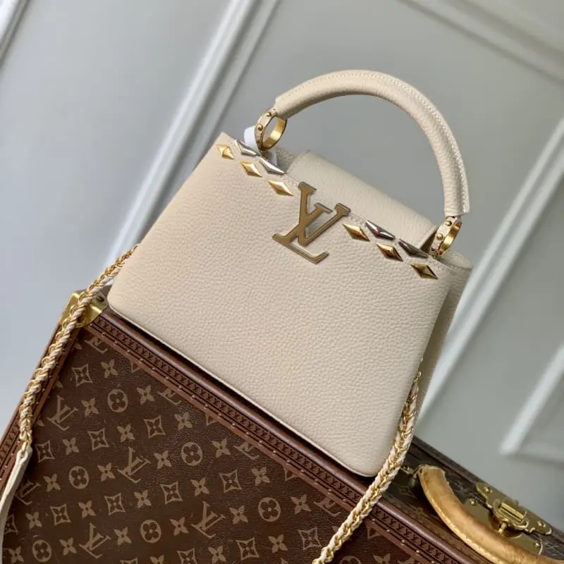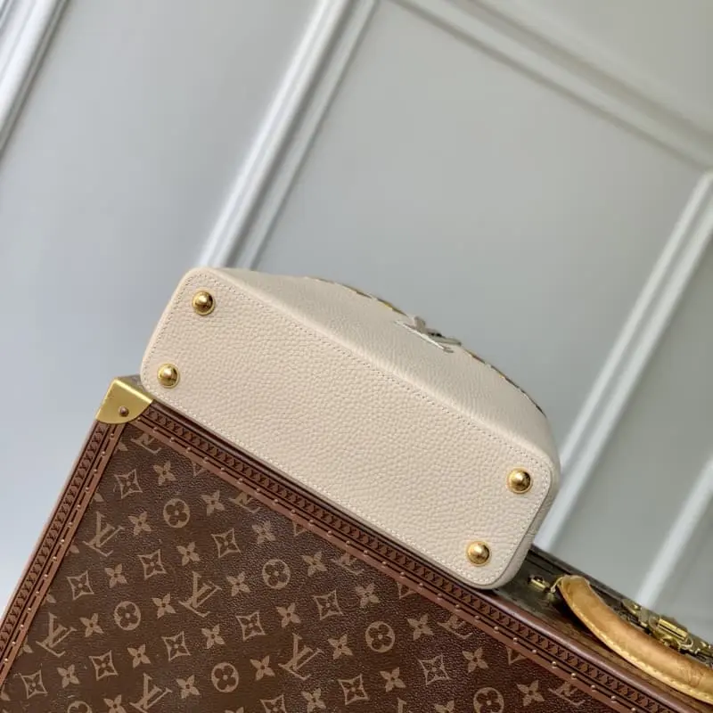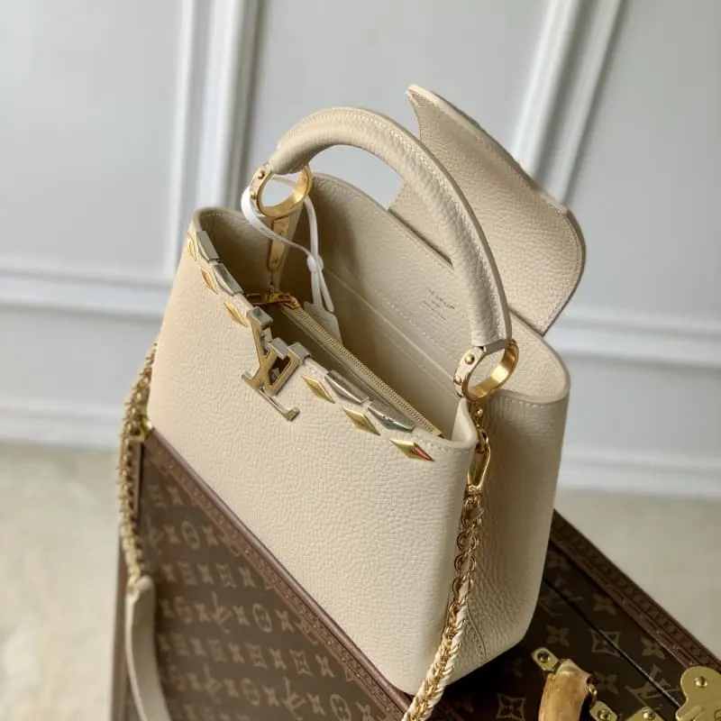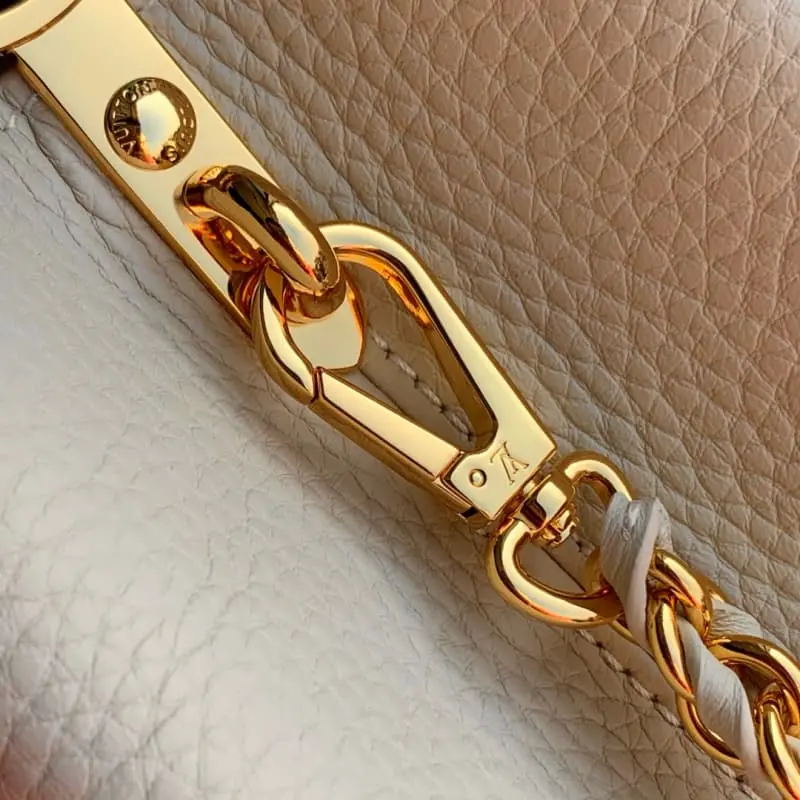 M12751 Small Apricot Capucines BB bag in Taurillon leather with mixed metal diamond-shaped Malletage elements on the top edge for a gorgeous interpretation of the classic design. The flap can be opened or closed. The neat interior has multiple pockets. The adjustable shoulder strap adds a crossbody option in addition to the top handle. 17.3 x 9 x 27 cm (H x W x L)