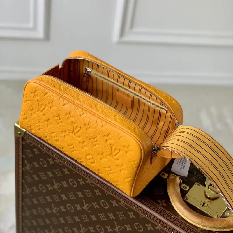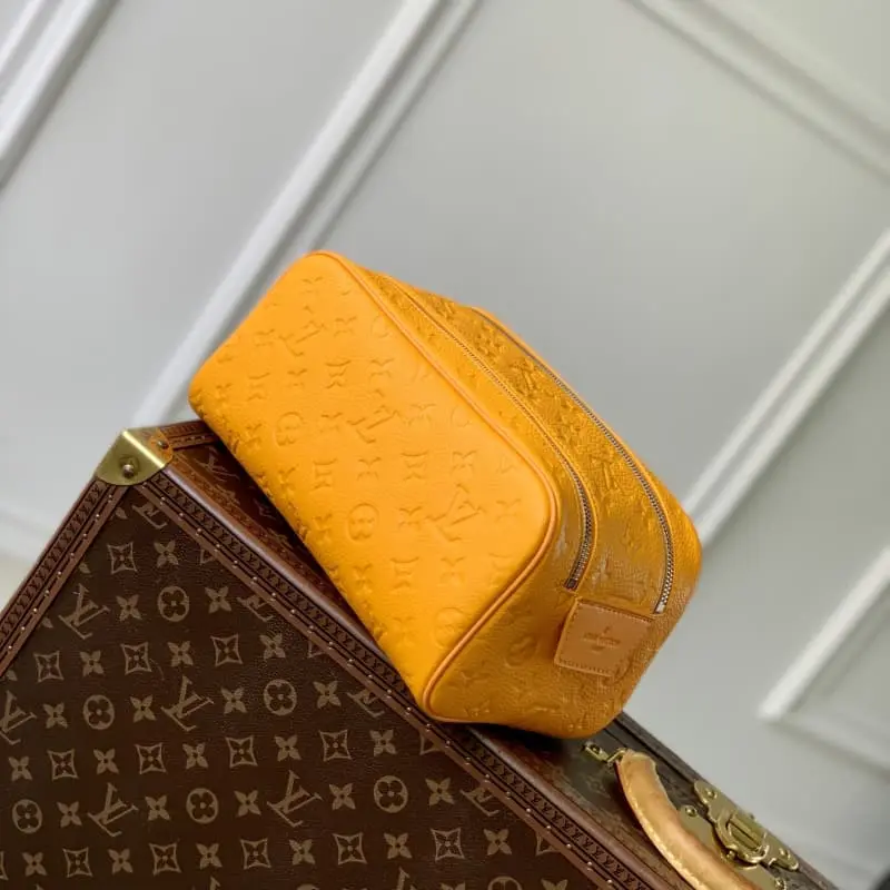 M12863 embossed yellow This model is made of top-grain cowhide leather, and the Dopp Kit toiletry bag is made of grain Taurillon leather with embossed Monogram pattern. It combines a double zipper wide-mouth design and a washable lining to properly store and carry toiletries. The sturdy handle allows for easy hanging from a bathroom hook. Dimensions: 28 x 15 x 16.5 cm