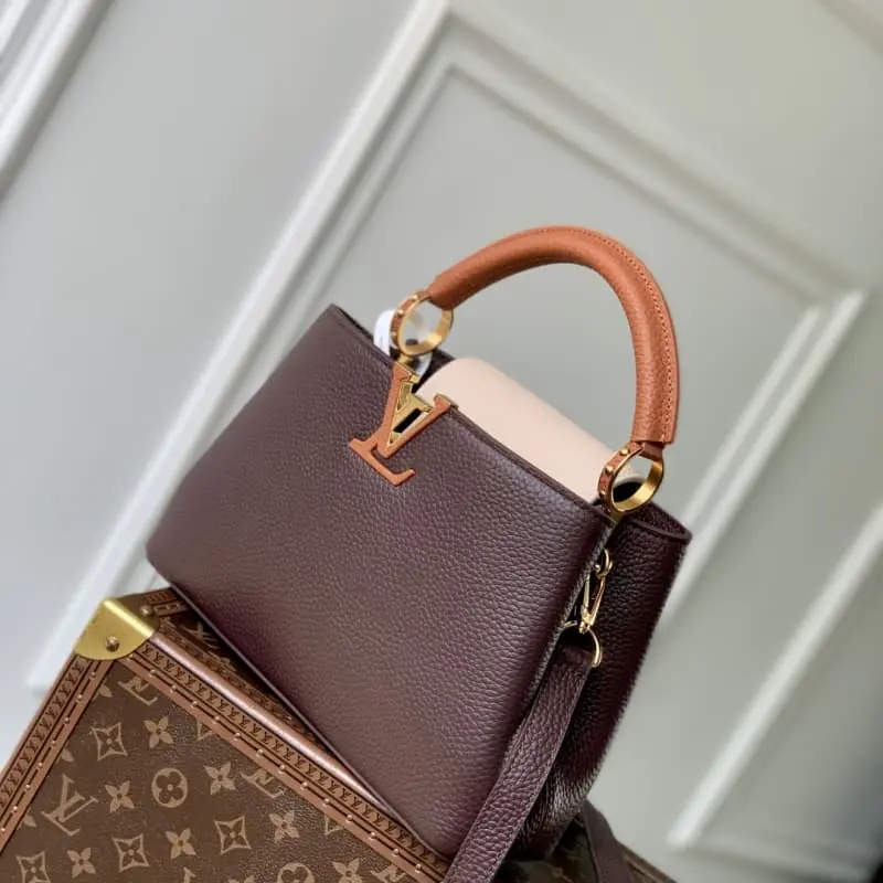 M12952 Small Introducing the Tricolor Capucines Small embodies timeless sophistication in a seasonal palette. The classic crossbody style is crafted in luxurious Taurillon leather with gold hardware and the iconic LV initials. Both stylish and practical, the organized interior includes a zippered pocket for valuables. Removable and adjustable shoulder strap if needed . 17.3 x 9 x 27 cm (H x W x L)