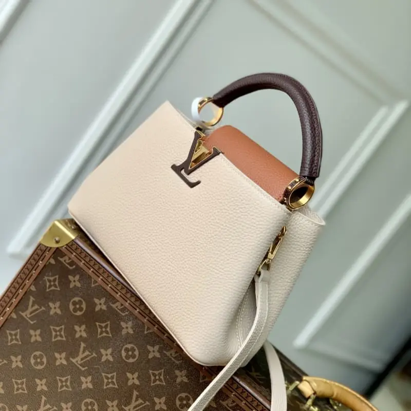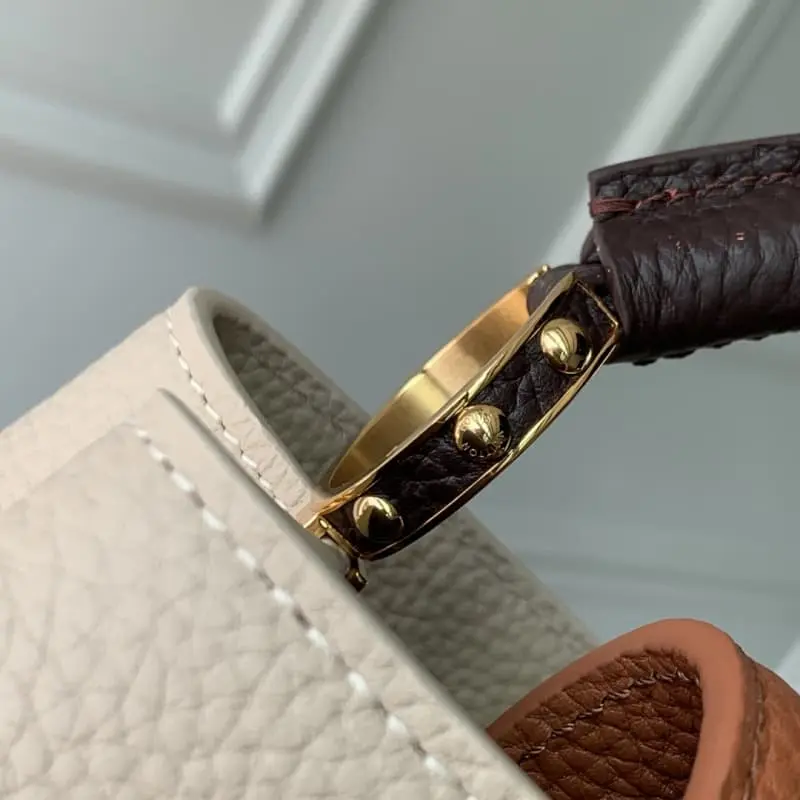 M12956 Small Introducing the Tricolor Capucines Small embodies timeless sophistication in a seasonal palette. The classic crossbody style is crafted in luxurious Taurillon leather with gold hardware and the iconic LV initials. Both stylish and practical, the organized interior includes a zippered pocket for valuables. Removable and adjustable shoulder strap if needed. 17.3 x 9 x 27 cm (H x W x L)