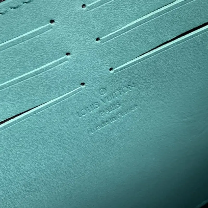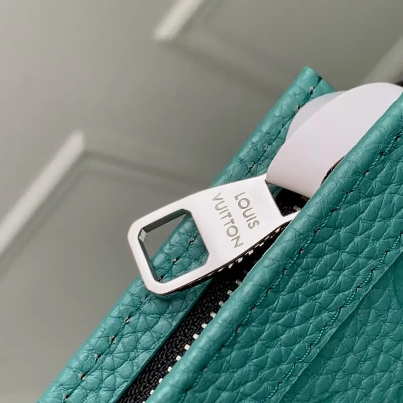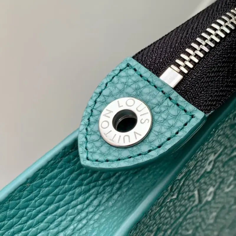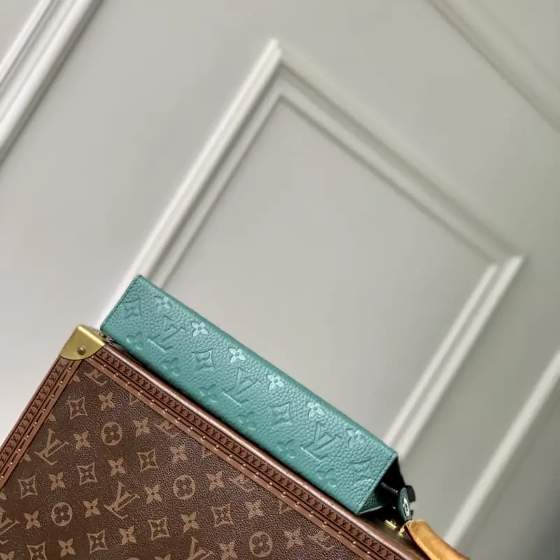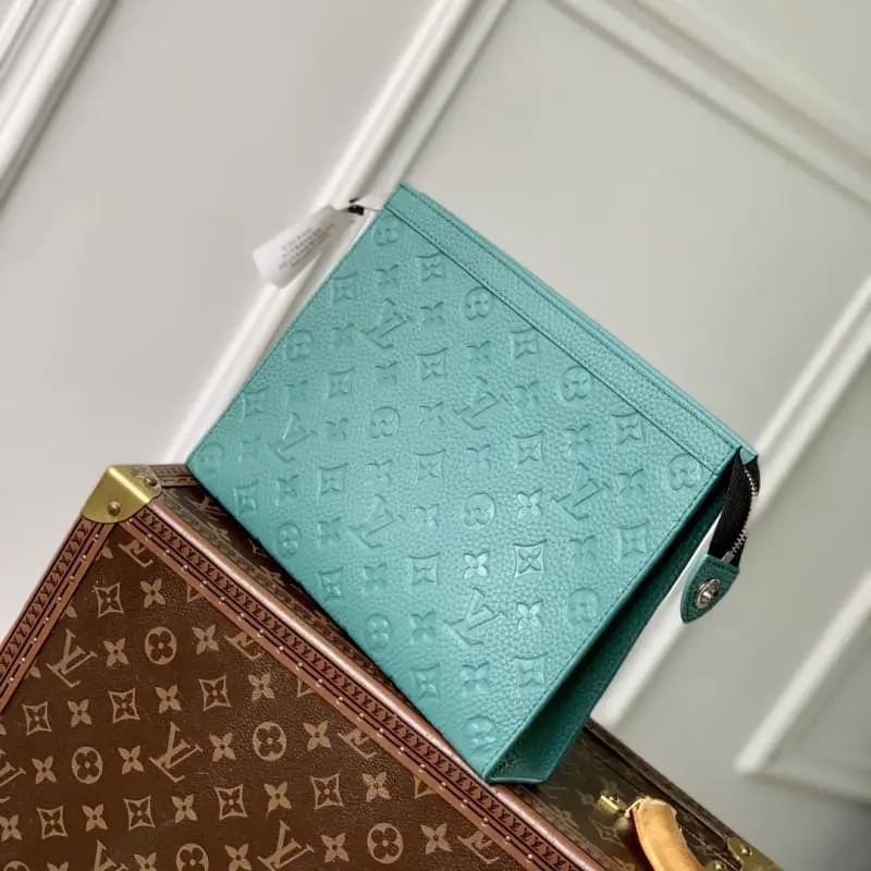 M13666 New Green POCHETTE VOYAGE Clutch This Pochette Voyage Clutch is made of Taga lychee leather with LV monogram on one corner and shiny metal parts. The zippered card slot and main compartment can hold small items. Detailed features! 27 x 21 x 6 cm, (length x height x width)