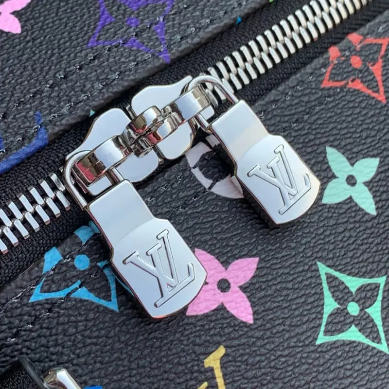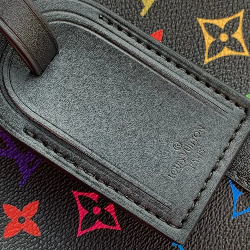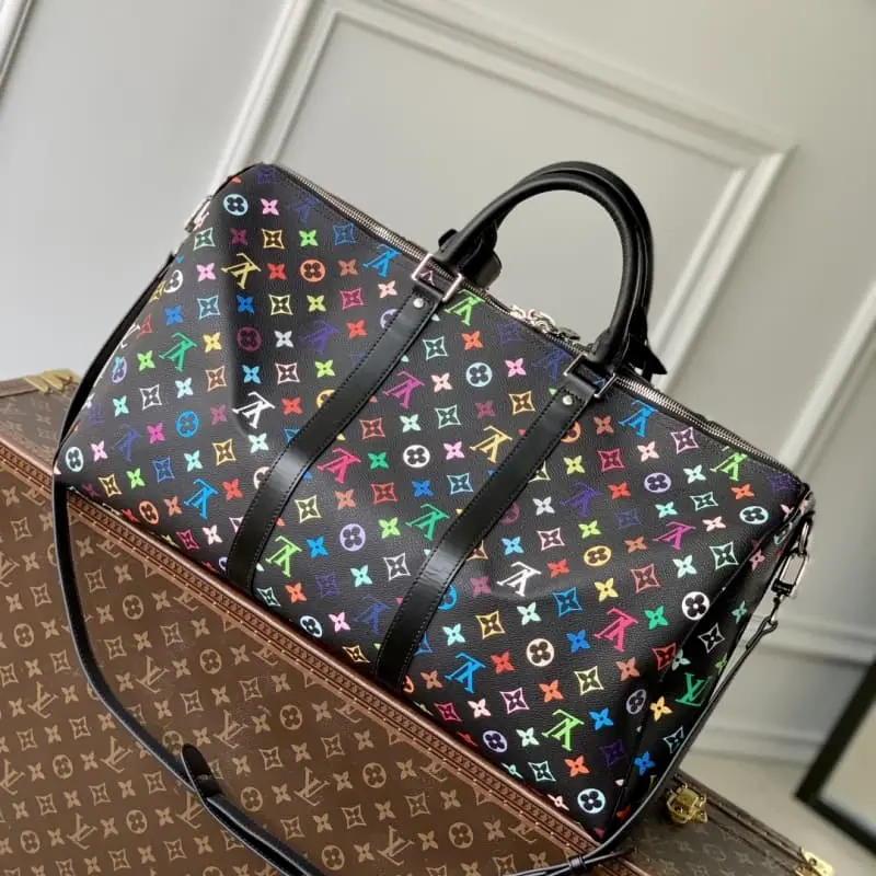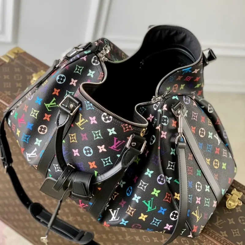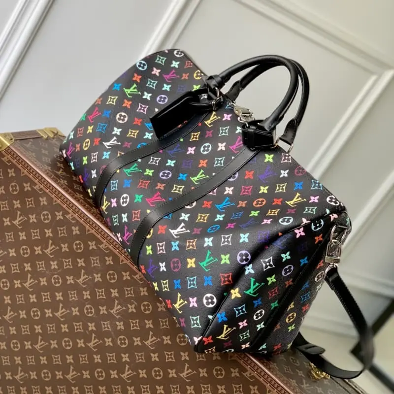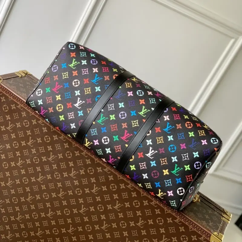 M13745 The Keepall Bandouli??re 50 travel bag is crafted from Monogram coated canvas in rainbow hues, a playful nod to the distinctive style of renowned Japanese artist Takashi Murakami. The size of the carry-on luggage provides ample space, and the neat leather side straps enrich the structure. Padlocks, designer tags and key holders harken back to the brand’s travel heritage, while a top handle and a removable and adjustable shoulder strap complete the look. 29 x 23 x 50 cm (height x width x length)