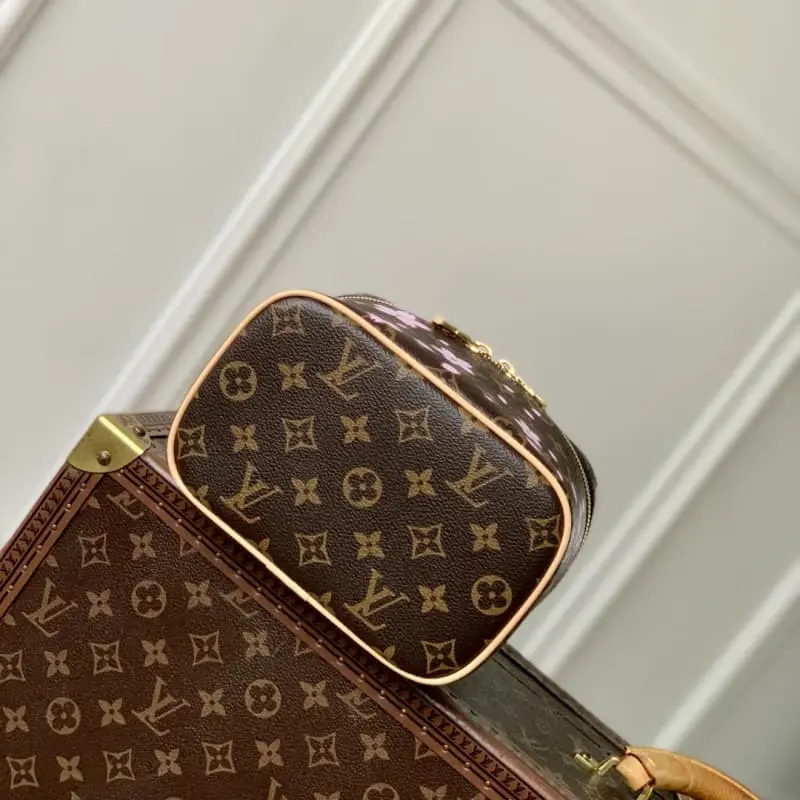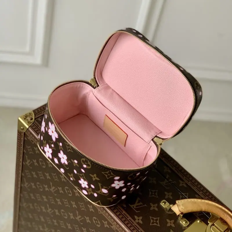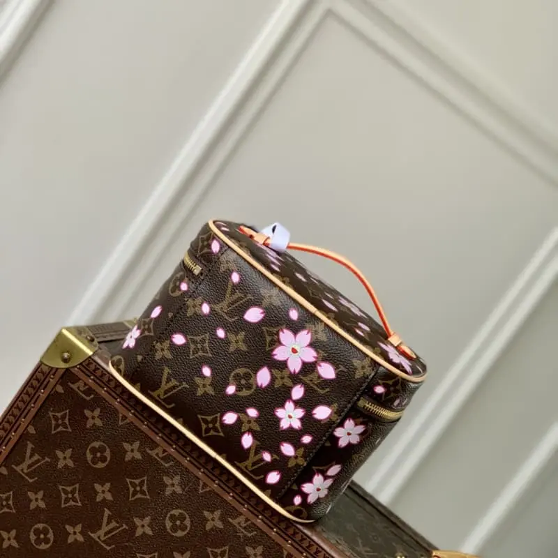 M14181 This Nice Mini Cosmetic Bag is made of Monogram coated canvas with rounded strokes to condense the boxy silhouette. The Cherry Blossom pattern exudes the joy of the Lbag x Takashi Murakami replica series. The cowhide leather handles highlight the exquisite details. The double zipper closure securely stores what you need on the go. 13.5 x 12 x 20 cm (H x W x L)