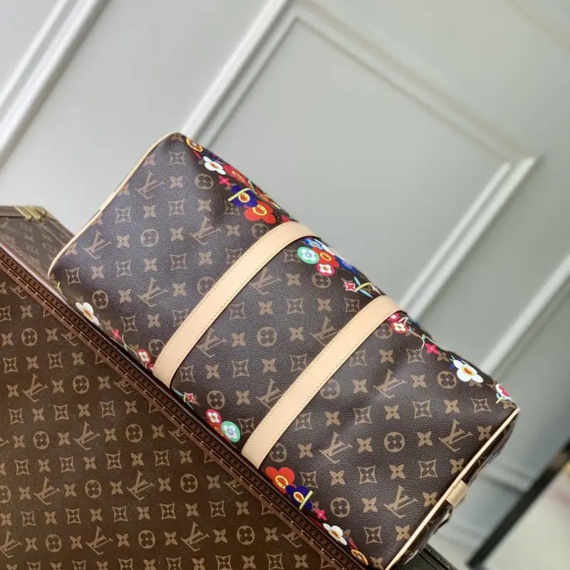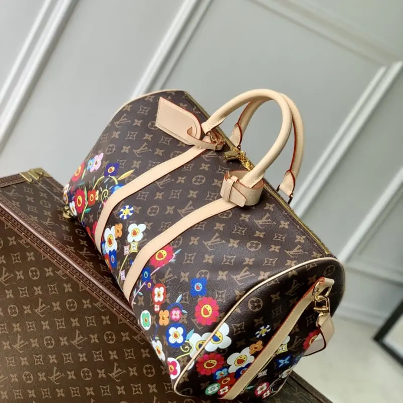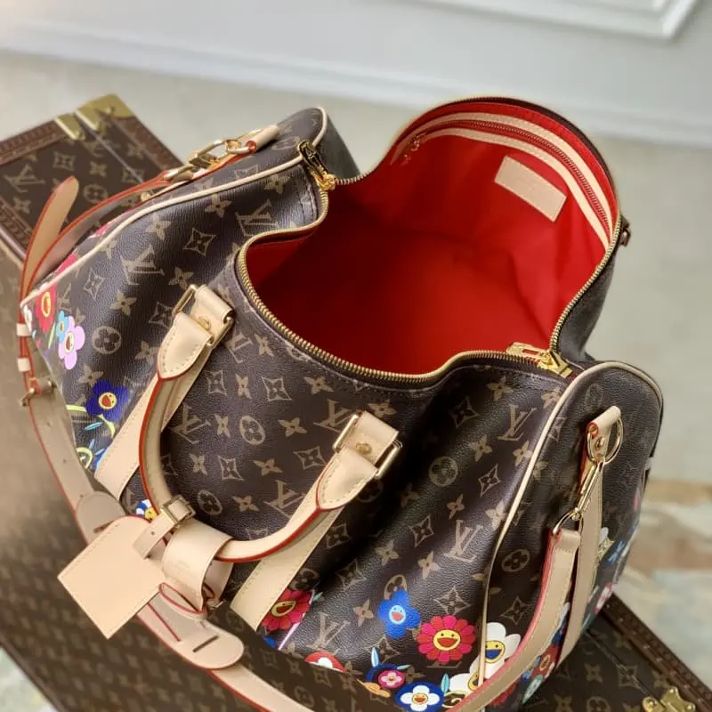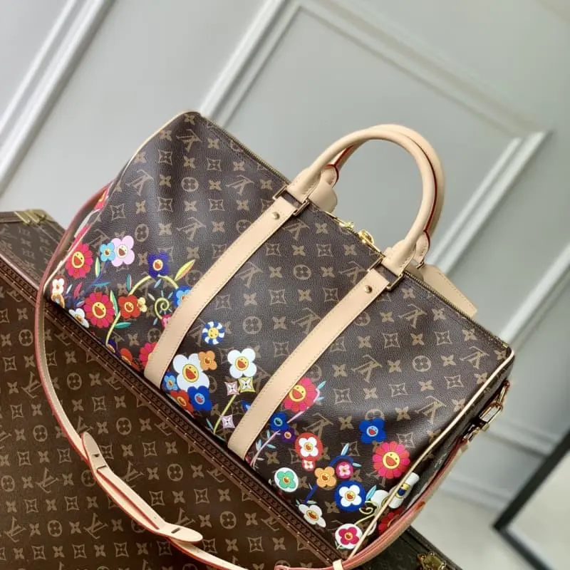 M14182 This Keepall Bandouli??re 45 travel bag is from the Lbag x Takashi Murakami collaboration. It uses classic coated canvas to create a carry-on size, and the cowhide material of the side straps, top handles and detachable crossbody shoulder strap collide visually. The dynamic Monogram flower blooms on the full-width Monogram pattern, subtly paying tribute to the “super flat” aesthetic style of Japanese artist Takashi Murakami. 27 x 20 x 45 cm (height x width x length)