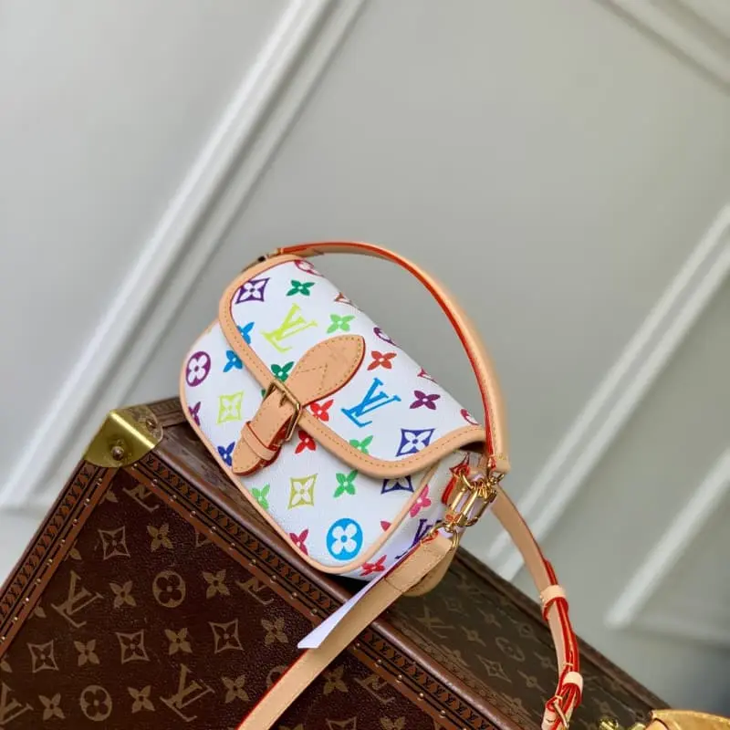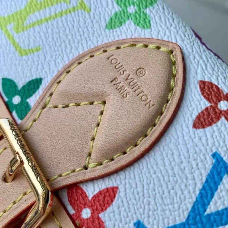 M14194 White 2025 Takashi Murakami Nano Diane is a mini version of the Diane handbag. This handbag is embellished with natural leather trim, showing a unique round flap and belt-style magnetic buckle design, suitable for placing mobile phones and other essential items. It is also equipped with a detachable handle and a detachable shoulder strap with adjustable length for a variety of carrying methods. 19 x 10.5 x 6 cm